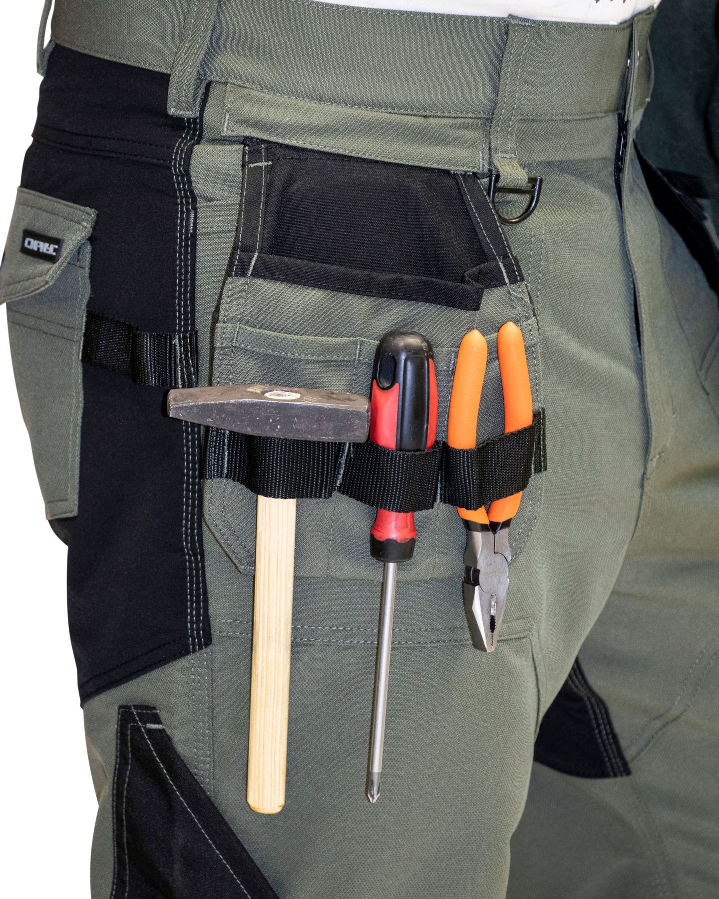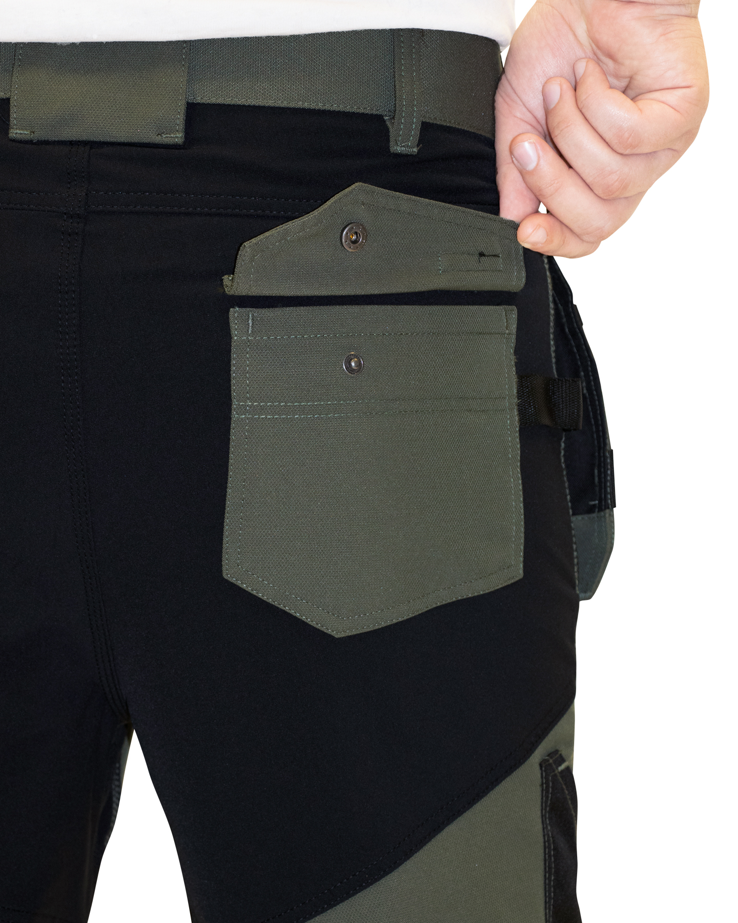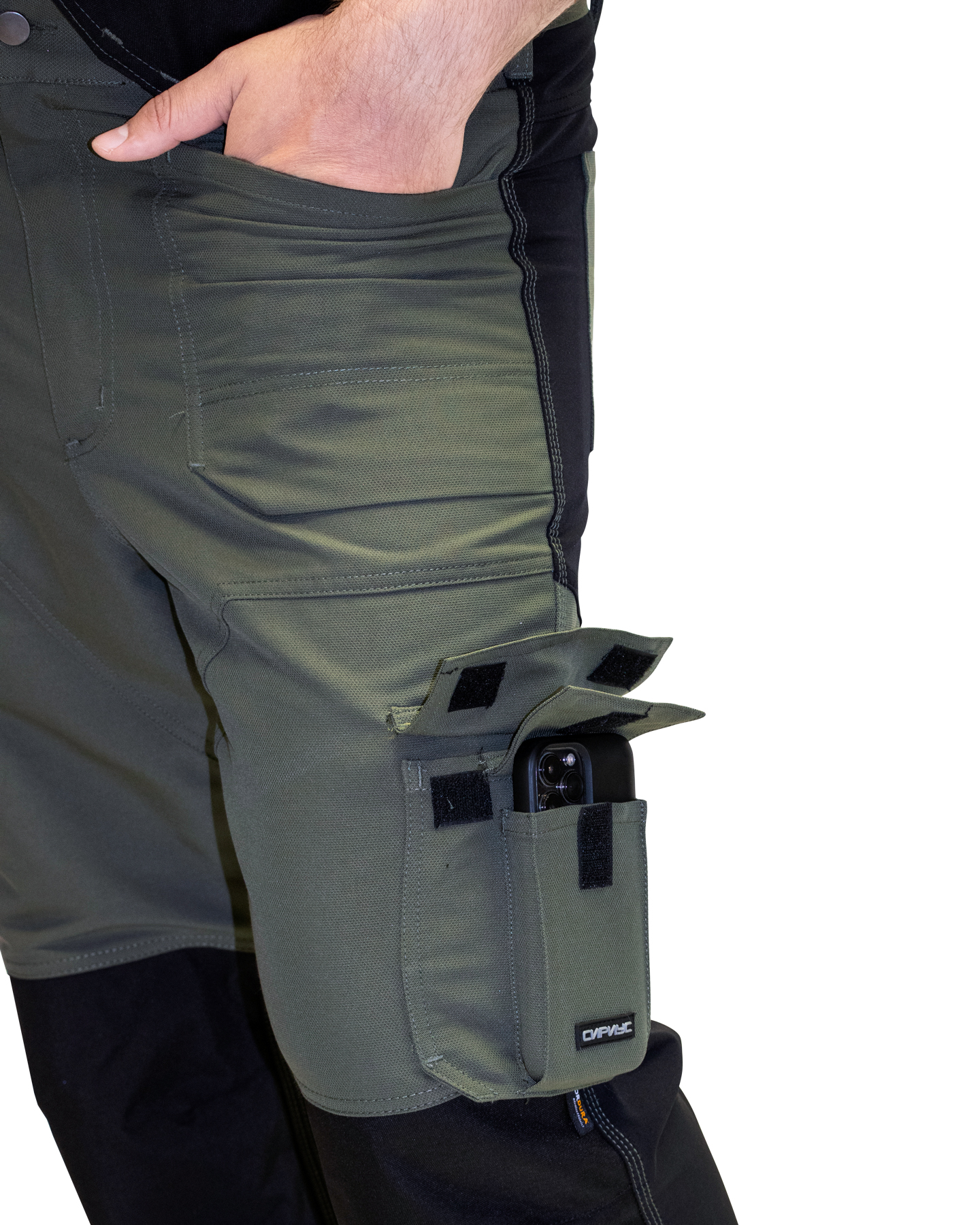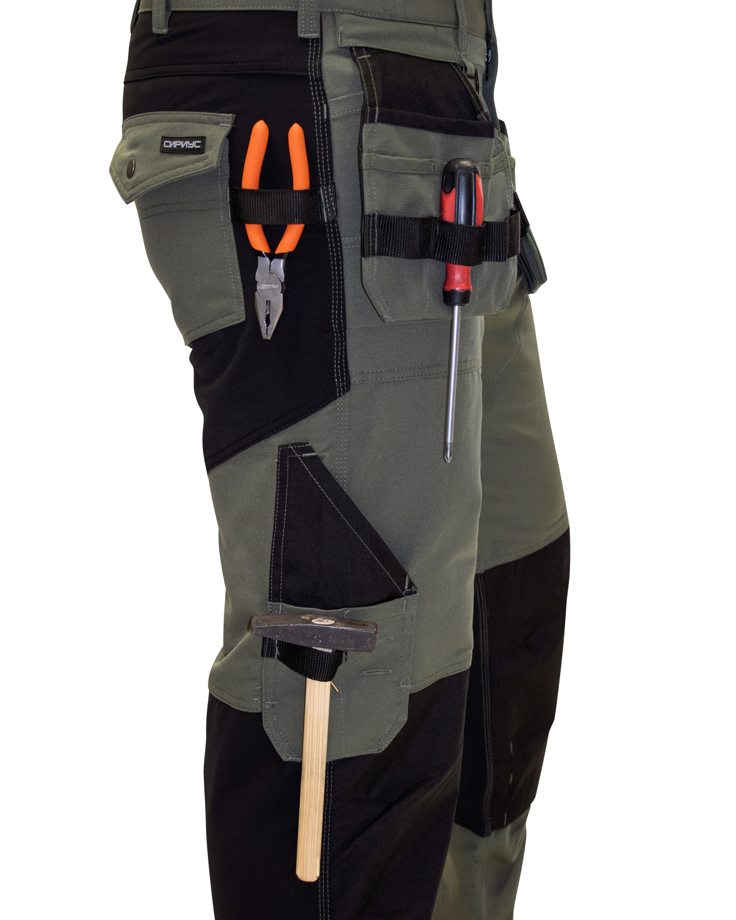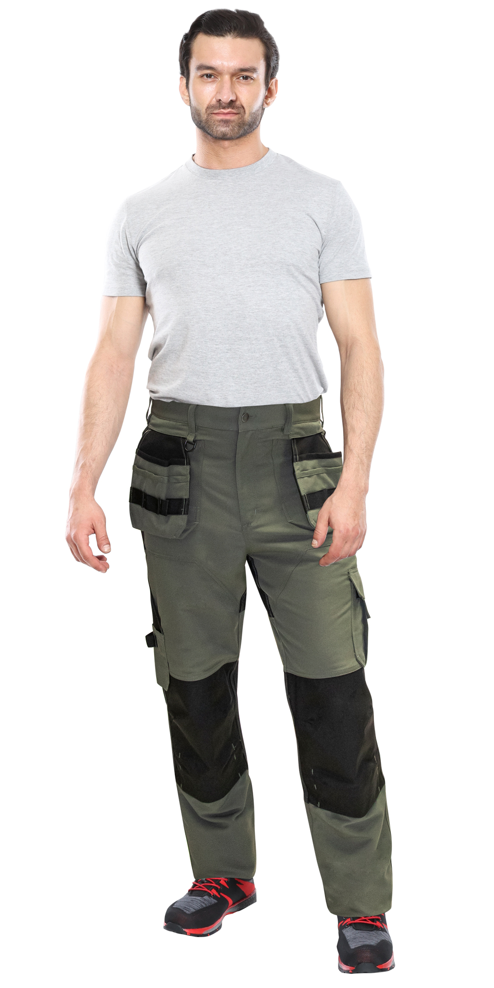 Брюки прямого кроя, с застежкой спереди на молнию, с отрезным поясом, с карманами спереди, сзади и на боковых швах, с объёмными наколенниками из плотной полиэфирной ткани с нижним входом для амортизационного вкладыша. Вверху шаговых швов ластовица из трикотажного полотна.