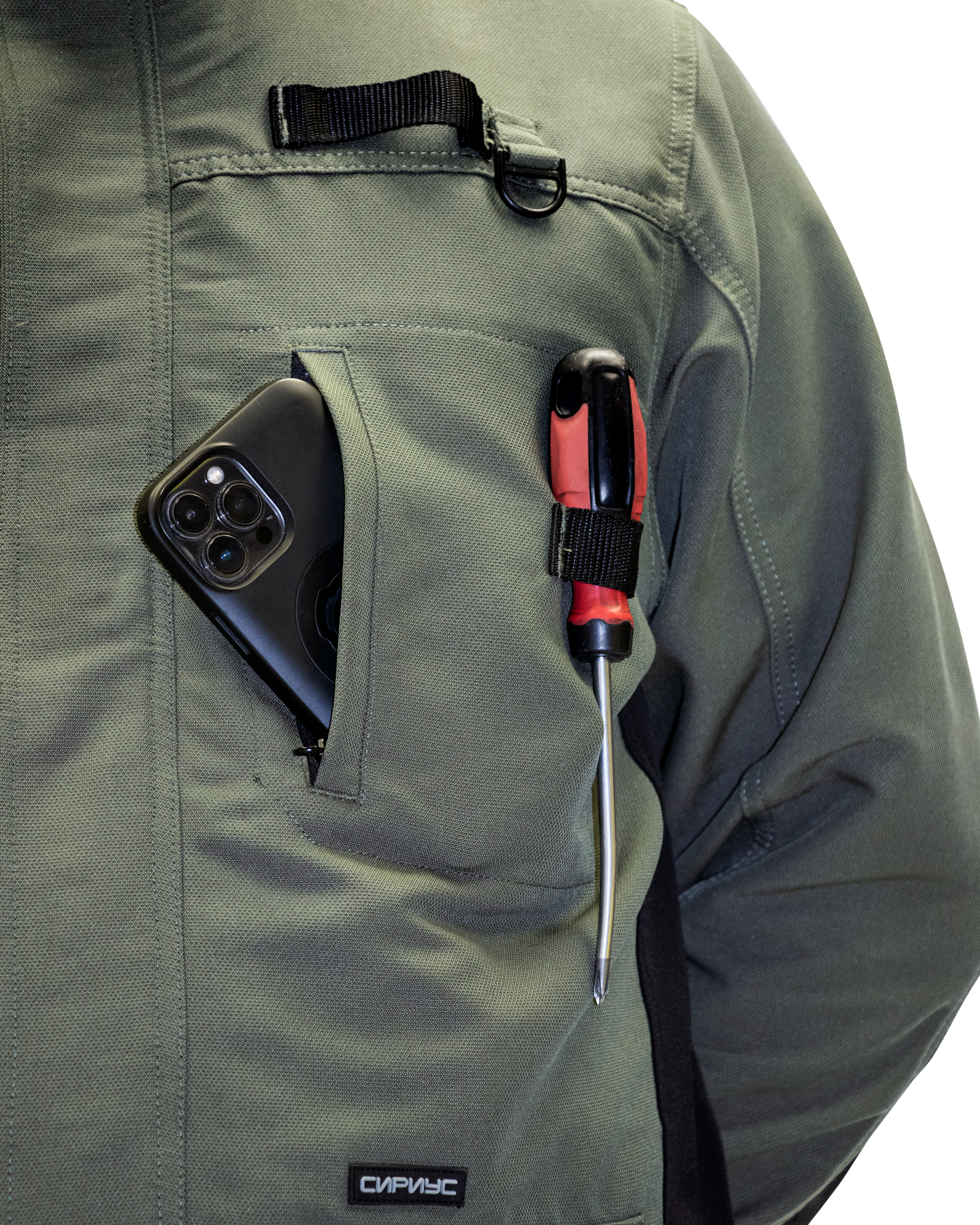 Куртка прямого силуэта, удлиненная, с центральной застежкой на молнию от верхнего края воротника до низа, накрытую ветрозащитным клапаном с потайными липучками, с воротником стойка, с верхним и нижними накладными карманами. Рукава втачные. Объём по низу куртки и низу рукава регулируется хлястиками с липучками.