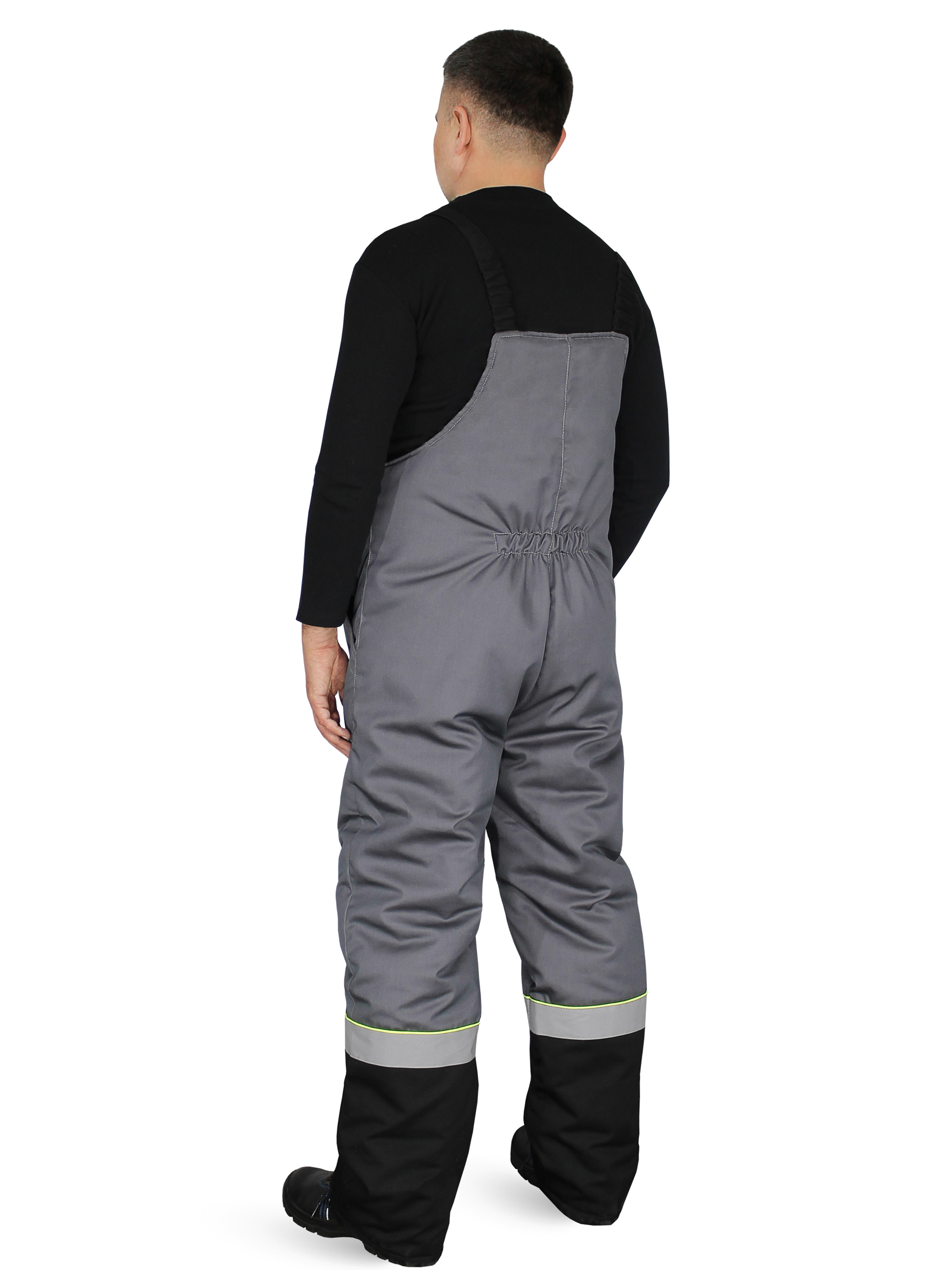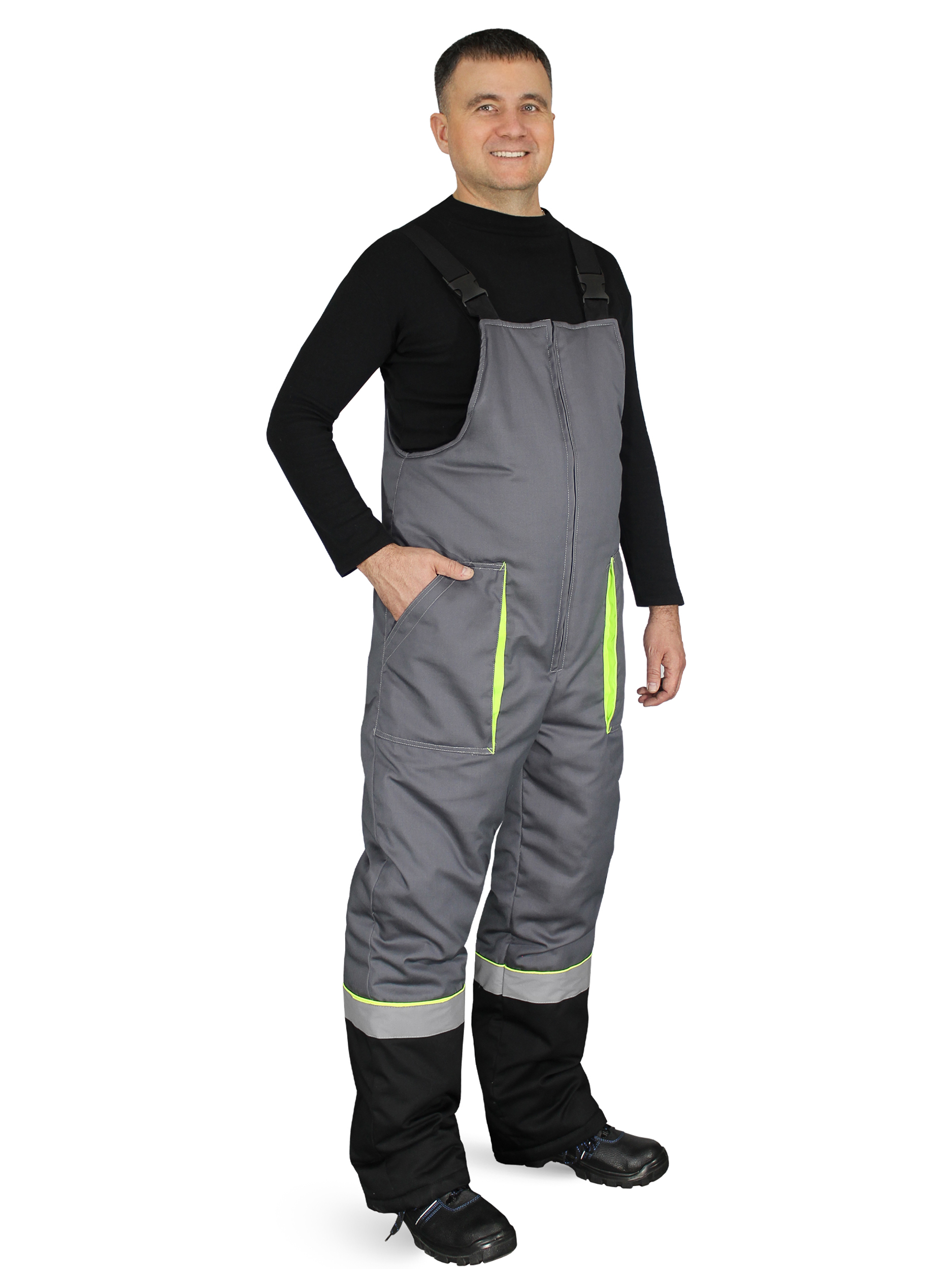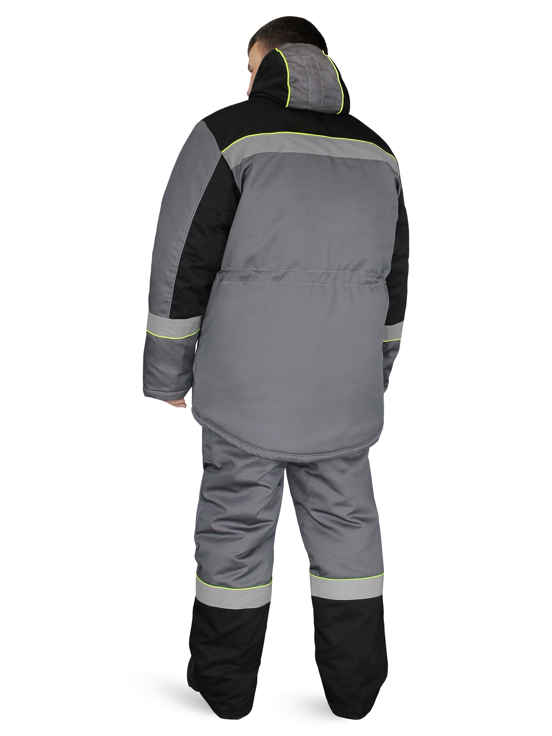 Костюм состоит из куртки и полукомбинезона. Подкладка костюма усилена ветрозащитной тканью. Куртка с центральной застежкой – “молнией”, закрытой ветрозащитной планкой на липучках. Нагрудные карманы закрыты клапаном на липучках. Объёмные нижние накладные карманы с клапанами на липучках. Под левым нагрудным карманом полукольцо для крепления пропуска. Рукава с манжетами из мягкого трикотажа. Воротник утепленный на подкладке из флиса. Капюшон съемный, на молнии, с регулировкой объема. Спинка с удлиненным низом. Внутри куртки карман для телефона и небольших документов. По талии куртки кулиса для регулировки. Полукомбинезон с центральной застежкой на двухзамковую молнию. Бретели из эластичной резинки с регулировкой длины и с застежкой - фастекс. Спереди объемные накладные карманы с боковым входом. На спинке - эластичная тесьма для регулировки объема по талии. На кокетках спереди и спинке куртки, по низу рукавов, по низу брюк полукомбинезона расположен СОП шириной 50мм и канты контрастного цвета.