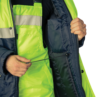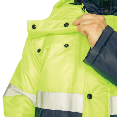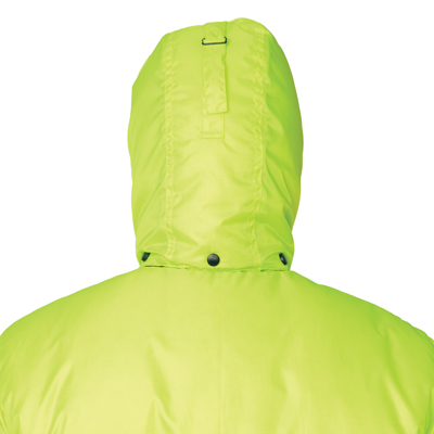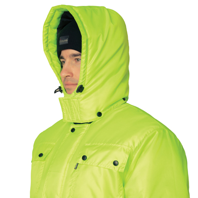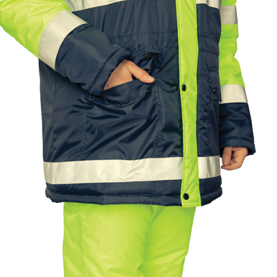 Капюшон: утепленный, съёмный на кнопках. Лицевой вырез капюшона регулируется с помощью шнура. По объему регулируется в области затылочной части с помощью хлястиков на полукольцах. Подбородочная часть застегивается на контактную ленту.