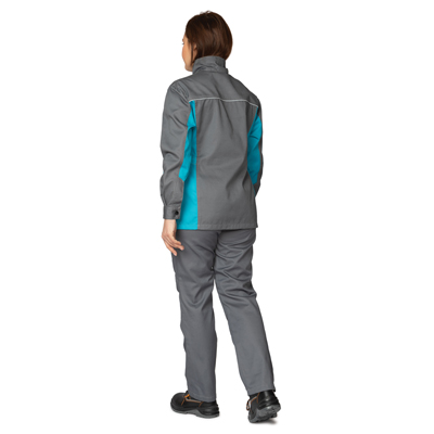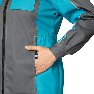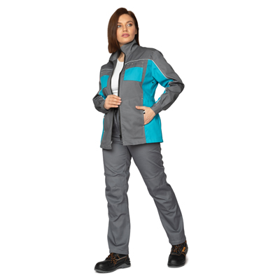 Костюм женский «Бренд 1» 2020 – это отличный вариант летней спецодежды для любых видов работ. Представленная в нашем каталоге серо-бирюзовая модель не маркая, смотрится стильно и имеет хорошие показатели прочности. Изюминка модели – это воротник-стойка. Костюм состоит из куртки и брюк прямого кроя. Он выполнен из смесовой ткани, в составе которой 35% хлопка и 65% полиэфира, с водоотталкивающей пропиткой. В этом костюме можно работать с нетоксичными растворами, ткань устойчива к истиранию и производственным загрязнениям и нетоксичным растворам.