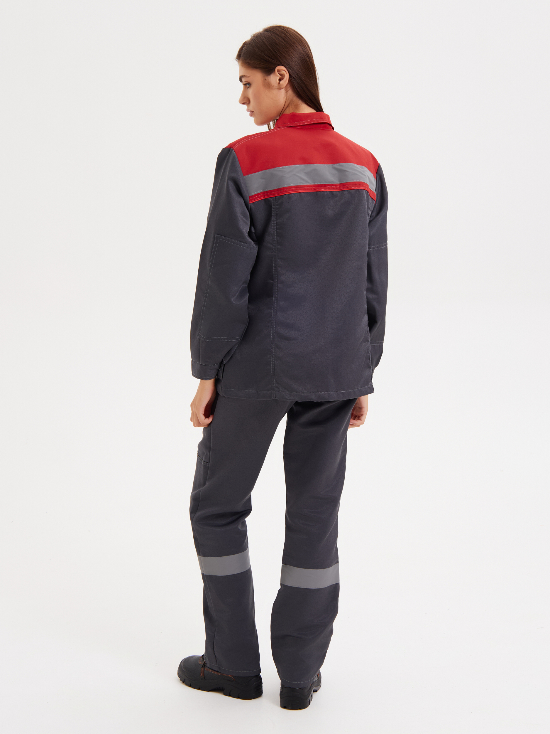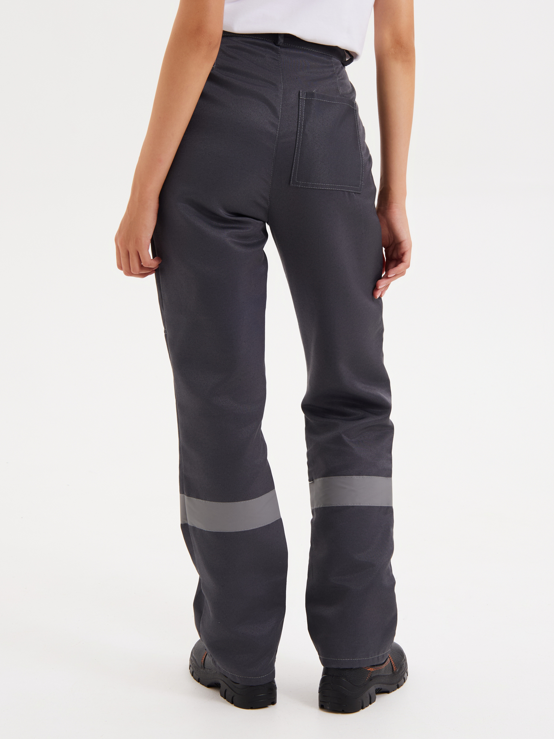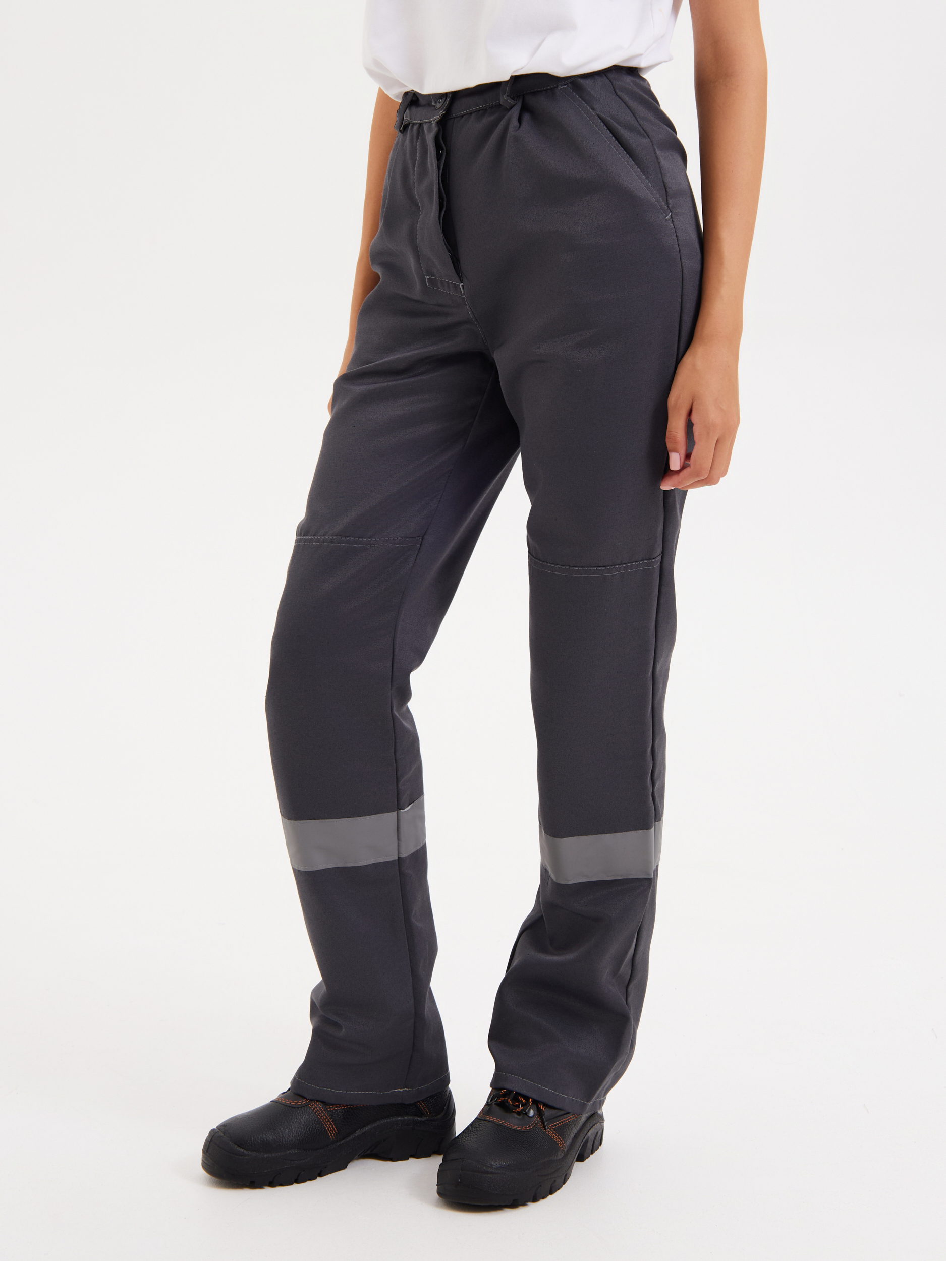 Костюм рабочий с брюками. Куртка прямого силуэта с супатной застежкой на пуговицы. Отложной воротник. Световозвращающая полоса по линии кокетки на полочках, на спине и по нижней части брюк, шириной 50 мм. На куртке имеются накладные карманы с клапанами: два нагрудных и два нижних. Манжеты рукавов застёгиваются на пуговицу. Все швы с контрастной отстрочкой. В области локтей и коленей усиления.
