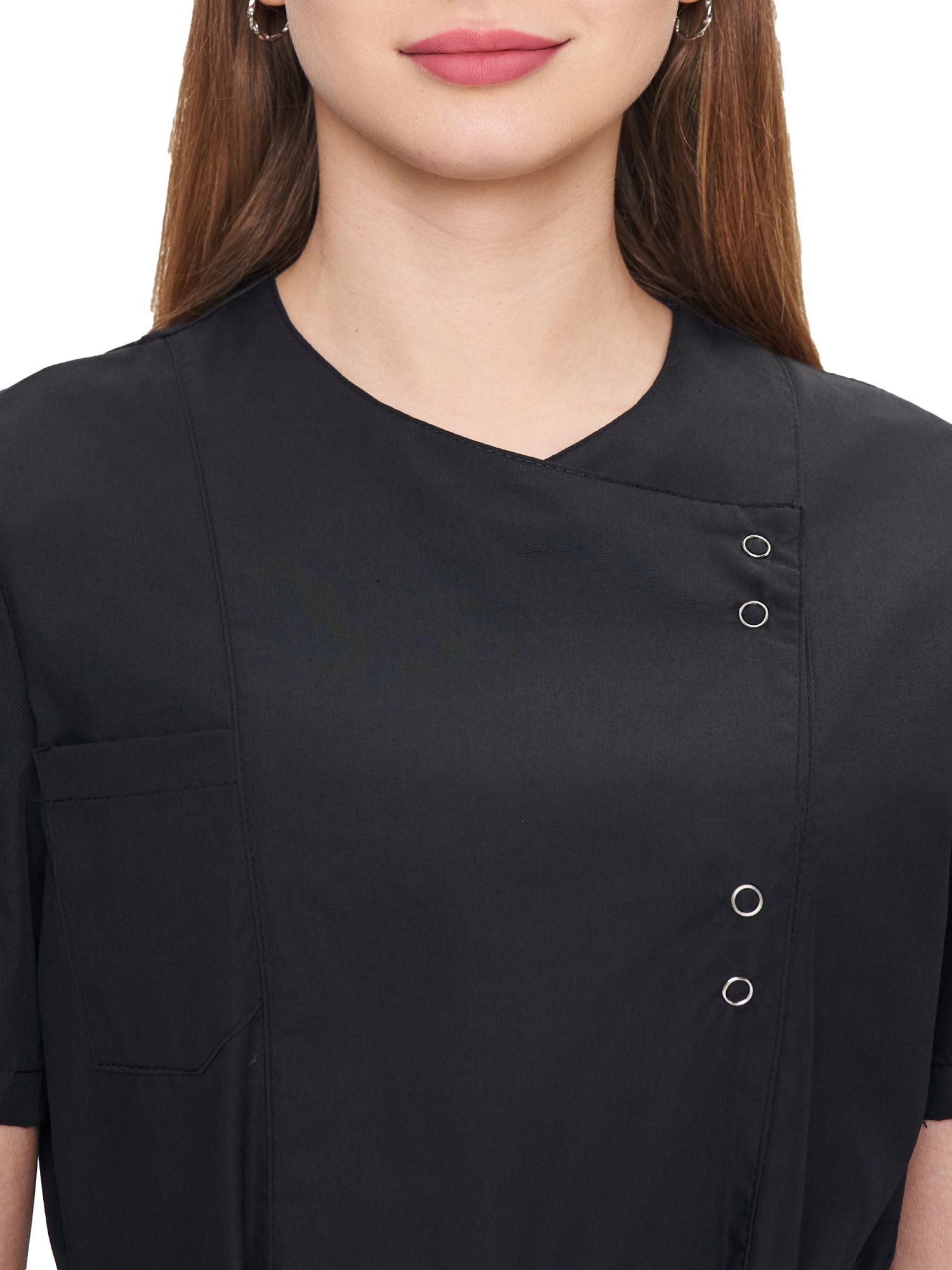 - Асимметричный крой, застегивается с помощью удобных кнопок.