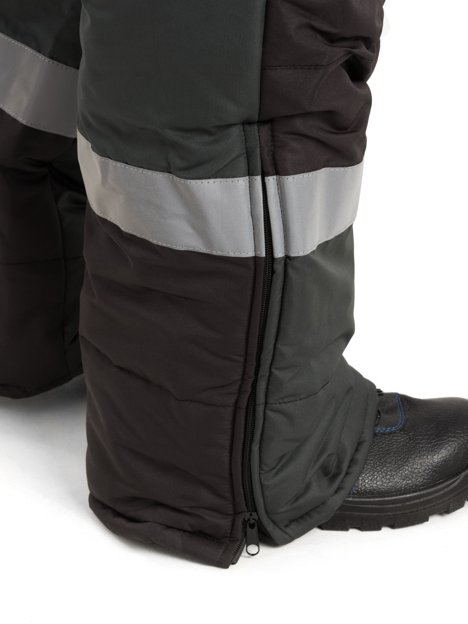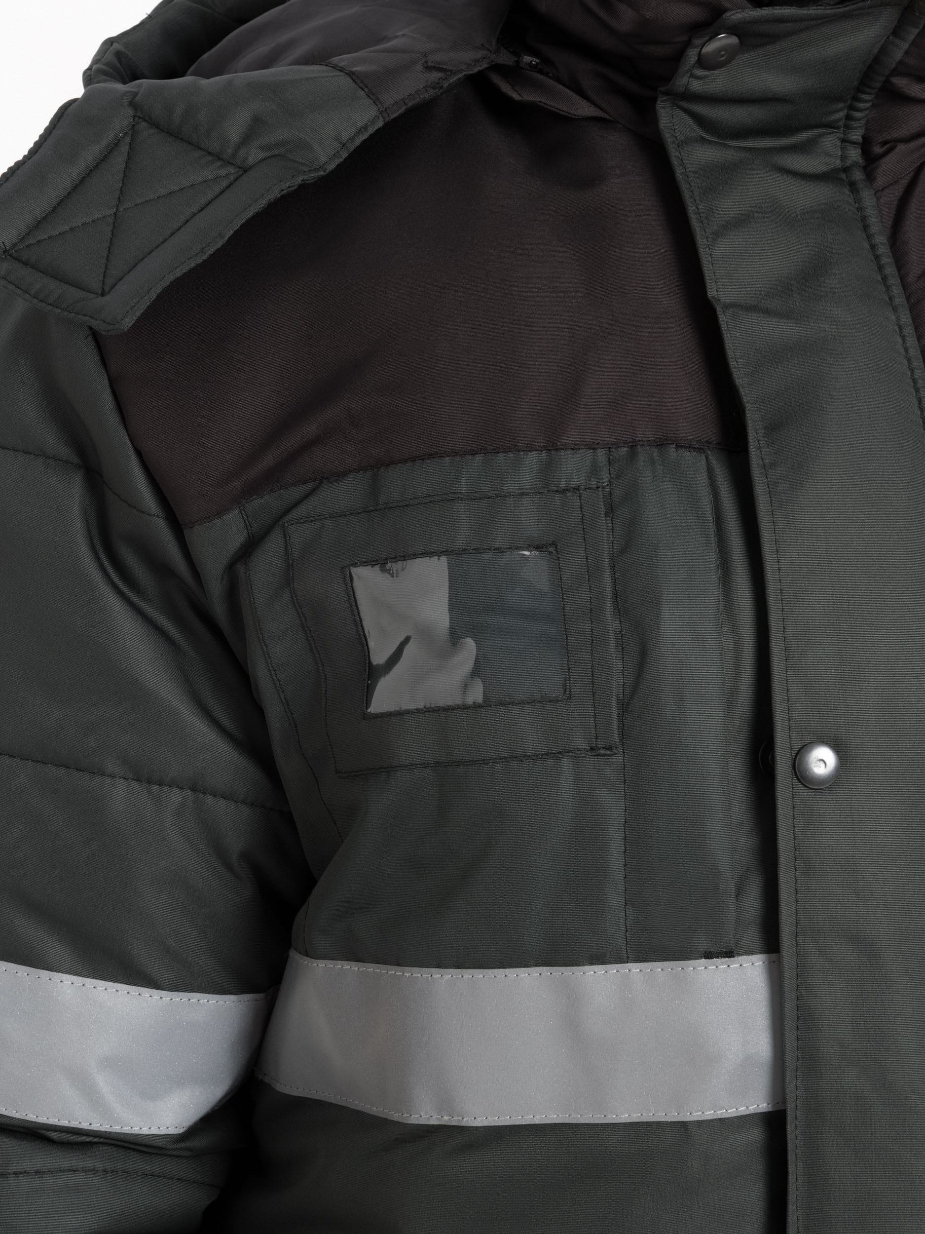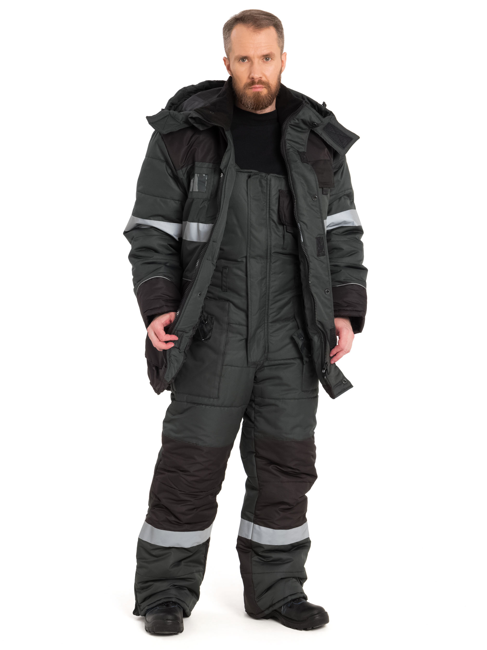 Костюм состоит из куртки и полукомбинезона. Куртка со светоотражающими полосами и кантом, с центральной застежкой на молнию, ветрозащитным клапаном на текстильную застёжку с чередованием кнопок и внутреннюю планку с уголком для защиты подбородочной части от молнии. Воротник стойка, с внутренней стороны флис, съёмный утеплённый капюшон. На правой полочке нагрудный карман для бейджа с прозрачной защитной плёнкой. Рукава с внутренними полушерстяными манжетами. Удлинённая по низу спинка. Внутренняя ветрозащитная юбка с застёжкой на кнопки. Полукомбинезон со светоотражающими полосами, с центральной застёжкой на молнию и планку с текстильными застёжками, на регулируемых по длине бретелях. На левой передней половинке нагрудный карман для сотового телефона. По низу брючин расположены разрезы на молниях с внутренними пуфтами для облегчения одевания на зимнюю обувь.