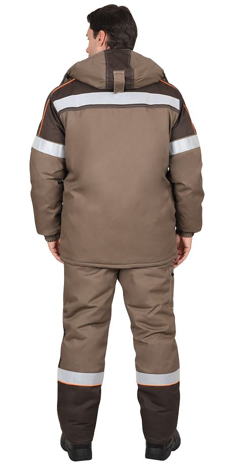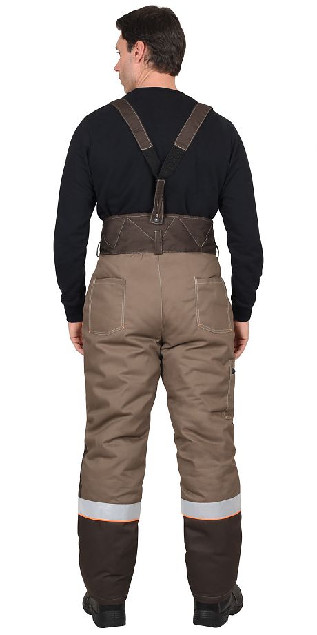 БРЮКИ прямые, с бретелями, с притачной утеплённой подкладкой, с центральной застежкой гульфика на тесьму «молния», широким фигурным поясом, с застежкой на поясе на две пуговицы, с тремя узкими шлевками на задних половинках и двумя щлевками-держателями фастексов на передних половинках. Внутренние боковые карманы с наклонным входом, с накладным карманом на правом боковом шве, застегивающимся на тесьму «молния». Наколенники на передних половинках, накладные задние карманы. СОП 50мм для обеспечения видимости.