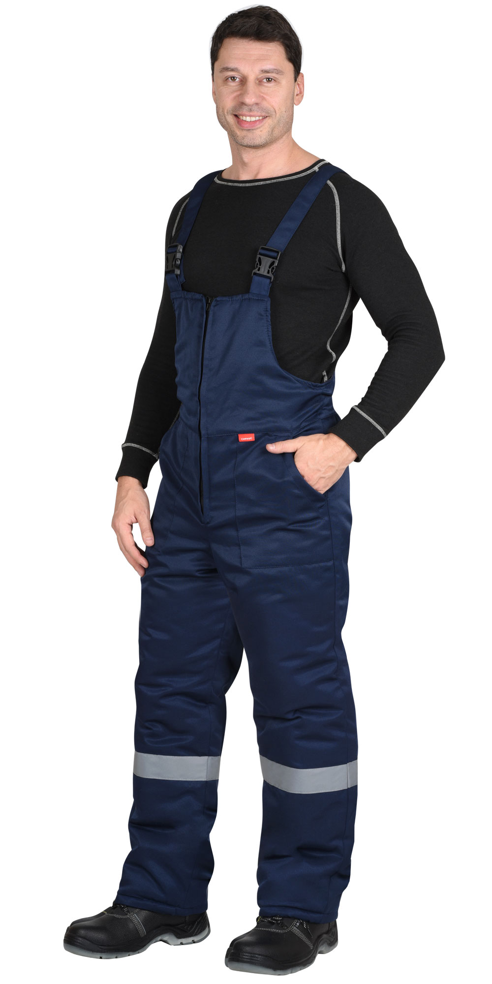 Полукомбинезон прямой, на утепленной подкладке, с центральной застёжкой на двухзамковую молнию R-вида, с накладными боковыми карманами, с резинкой по спинке, с регулируемыми бретелями. По низу полукомбинезона световозвращающая лента 50 мм для обеспечения сигнальной видимости.