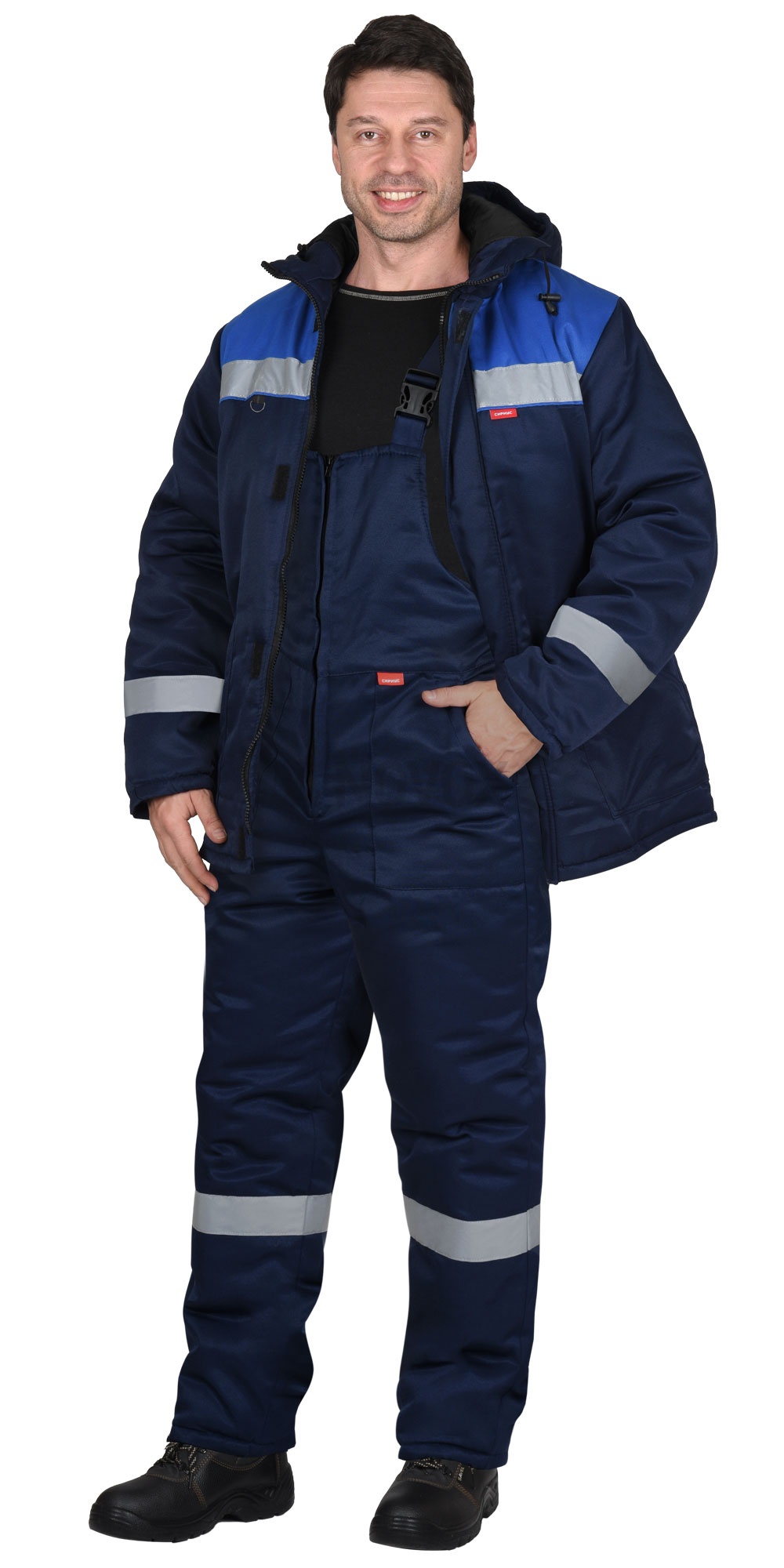Костюм зимний состоит из куртки и полукомбинезона, костюм со световозвращающей лентой 50 мм для обеспечения сигнальной видимости.