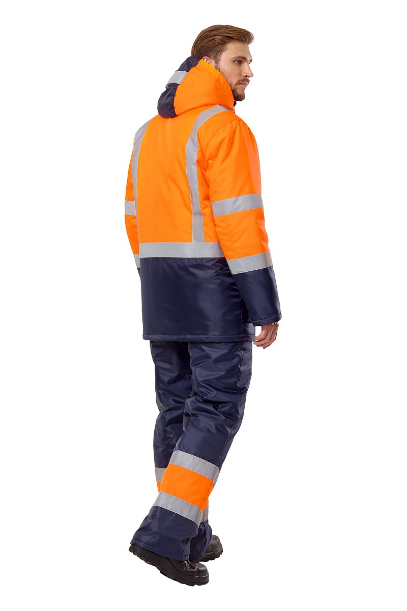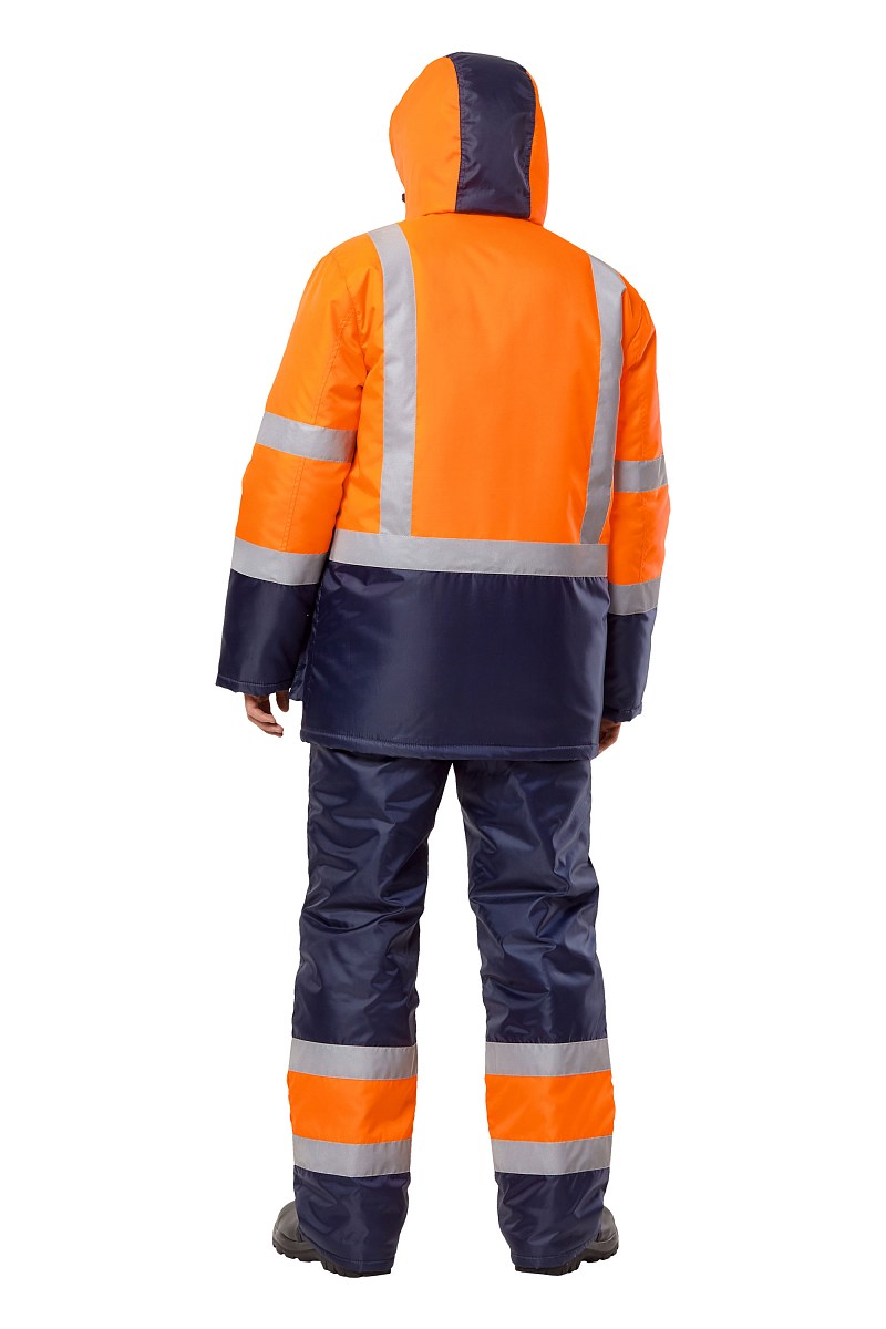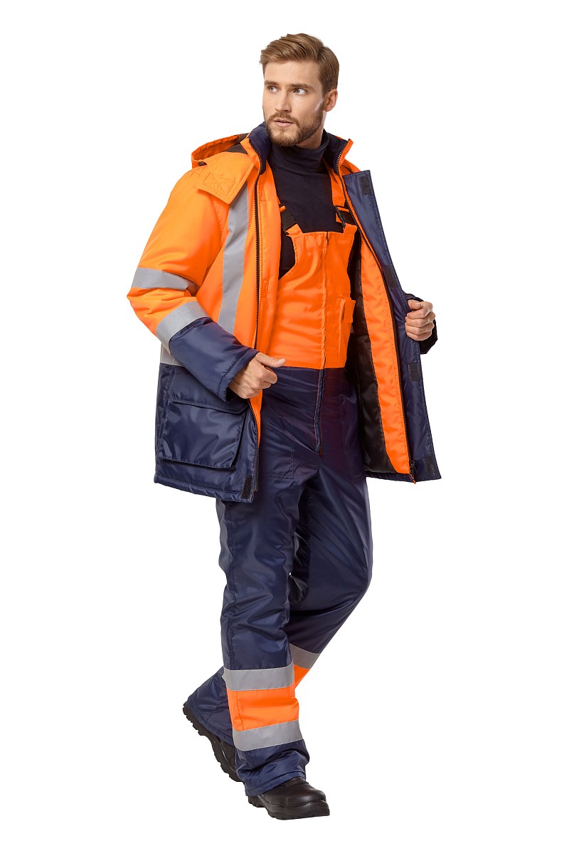Костюм из куртки и полукомбинезона 2 класса защиты от пониженных температур (III климатический пояс) и 3 класса в качестве сигнальной спецодежды повышенной видимости, для визуального обозначения присутствия носящих ее людей, при дневном освещении и ночью в свете автомобильных фар.