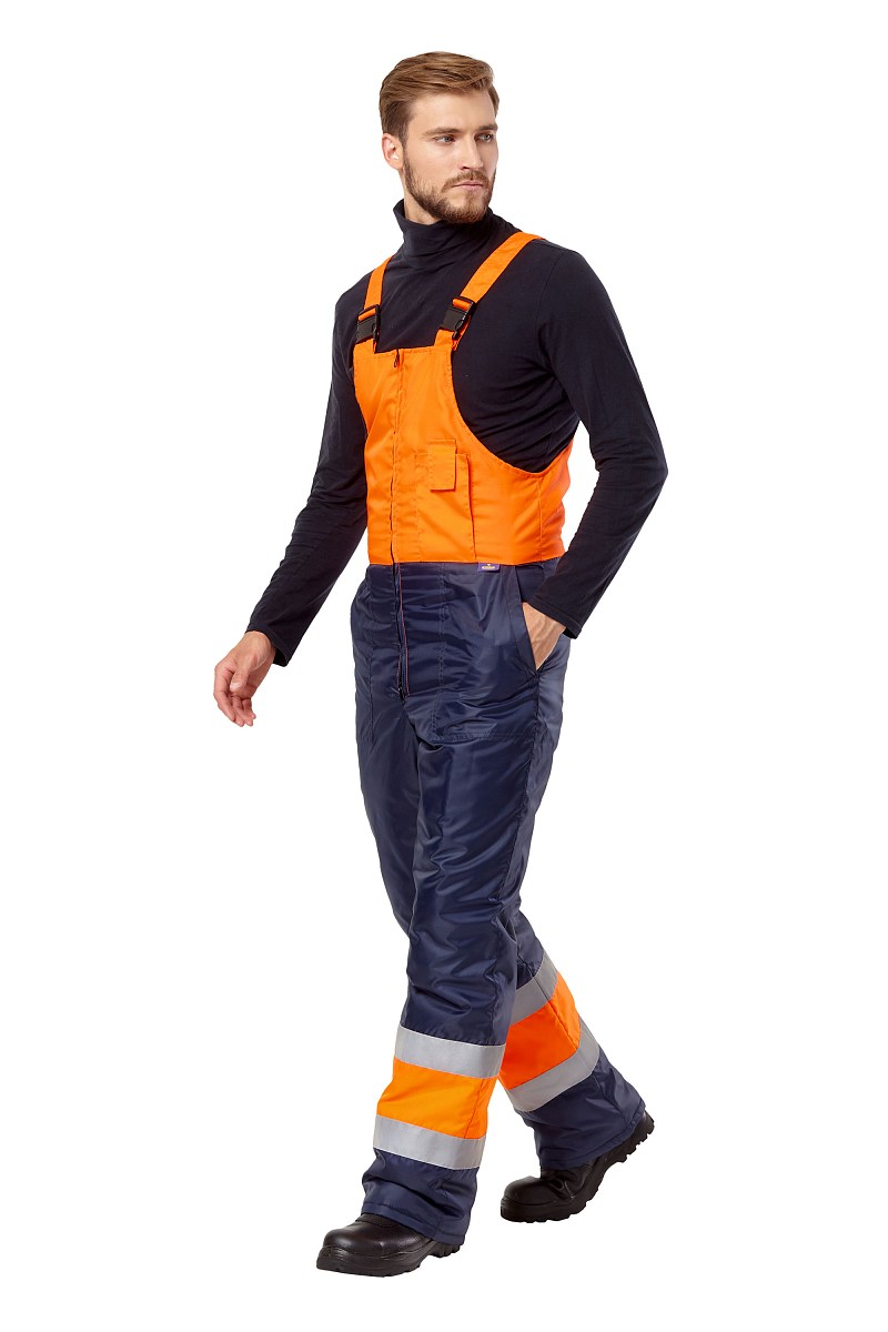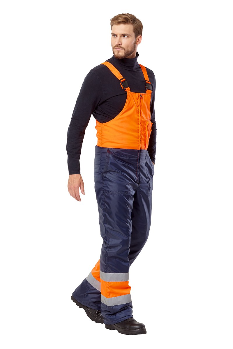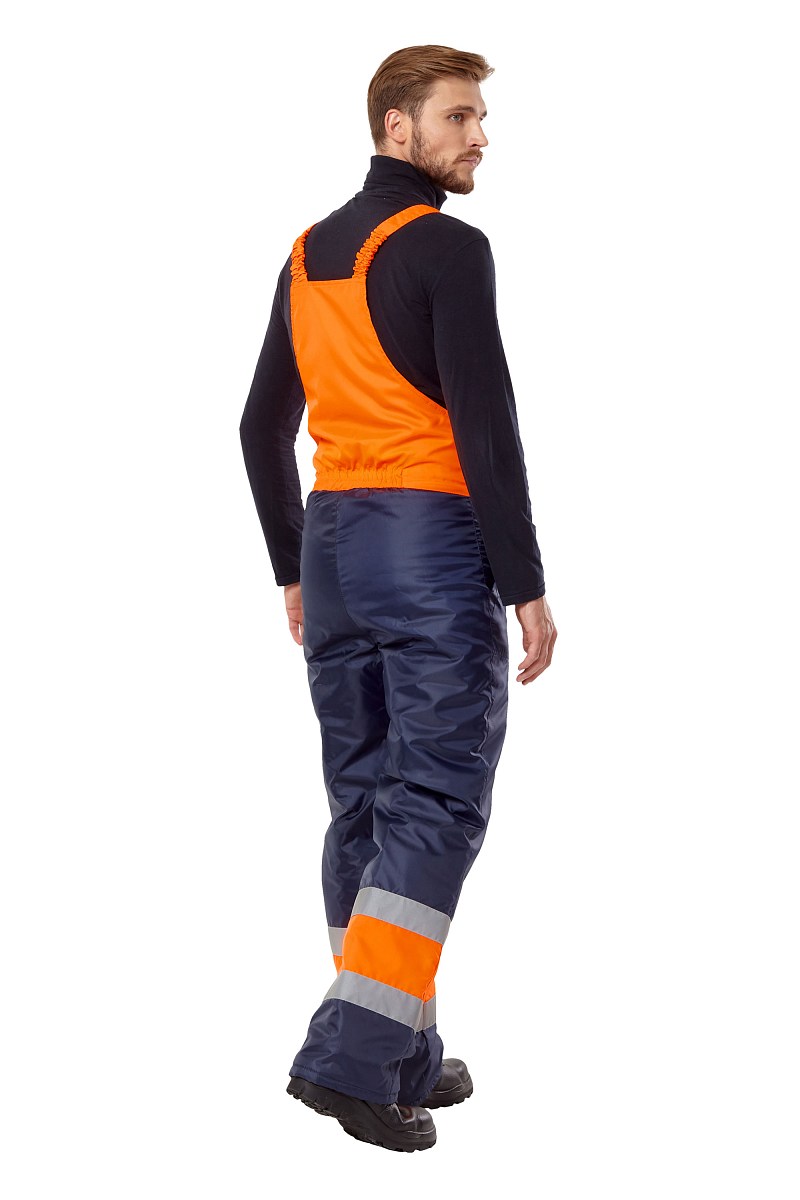 - Визуальные элементы защиты: две параллельные световозвращающие полосы шириной 50 мм в нижней части полукомбинезона, с расстоянием 10 см между полосами