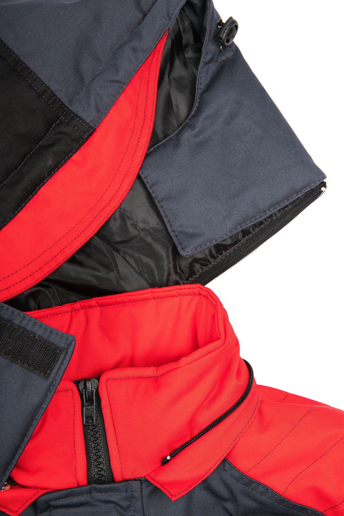 капюшон утепленный, состоит из центральной и боковых частей, пристёгивается к куртке на тесьму «Молния», регулируется по лицевому вырезу шнуром