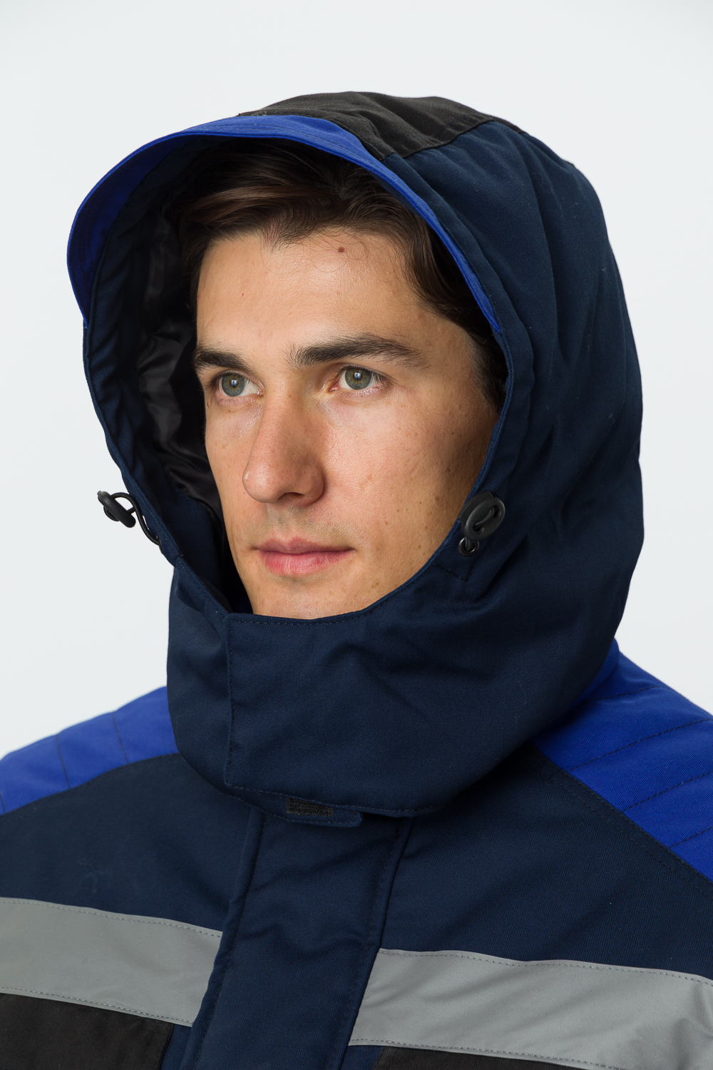 капюшон утепленный, состоит из центральной и боковых частей, пристёгивается к куртке на тесьму «Молния», регулируется по лицевому вырезу шнуром