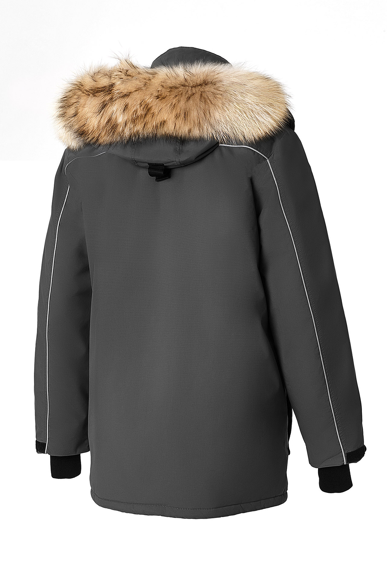 Съемный утепленный капюшон с опушкой из натурального меха енота.