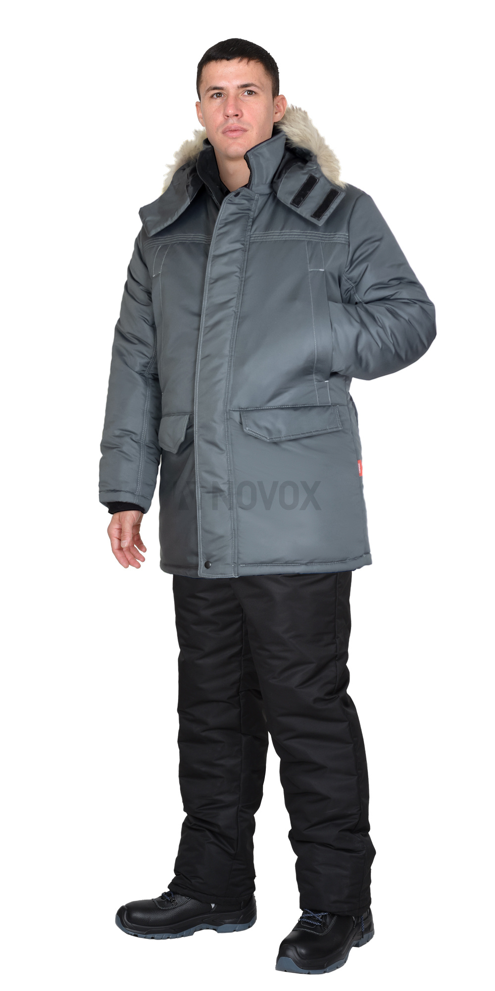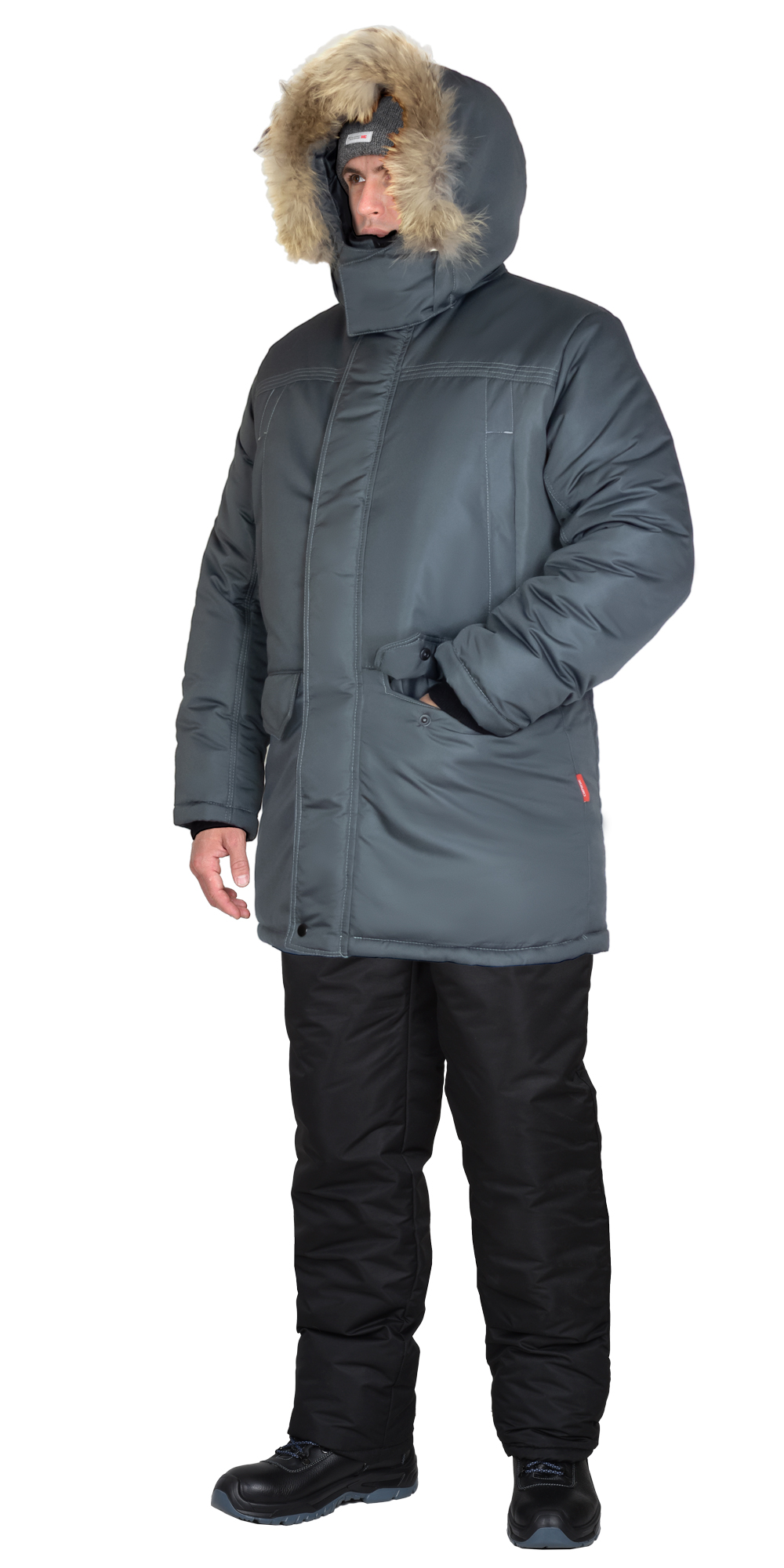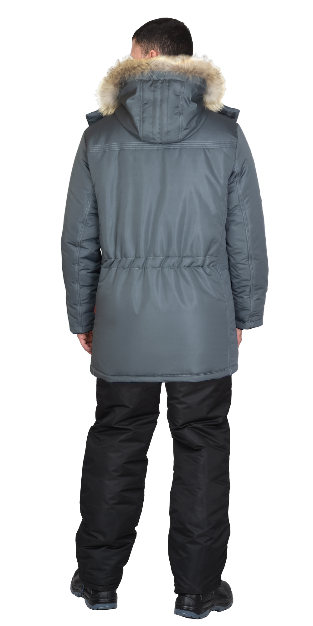 Куртка прямого силуэта, удлинённая, с утеплённой подкладкой, воротником стойка, центральной застёжкой на 2-х замковую молнию от края воротника до низа, накрытую внешним ветрозащитным клапаном от горловины до низа куртки с кнопками и внутренней ветрозащитной планкой. Куртка с верхними карманами с молнией, нижними карманами с клапаном и карманом на подкладке с молнией, втачными рукавами с внутренним трикотажным напульсником, съемным капюшоном с меховой натуральной опушкой, пристёгивающейся на молнию. По линии талии спинки резинка для более плотного прилегания по фигуре человека, также куртка с возможностью регулировки объёма по низу при помощи эластичного шнура с фиксаторами.