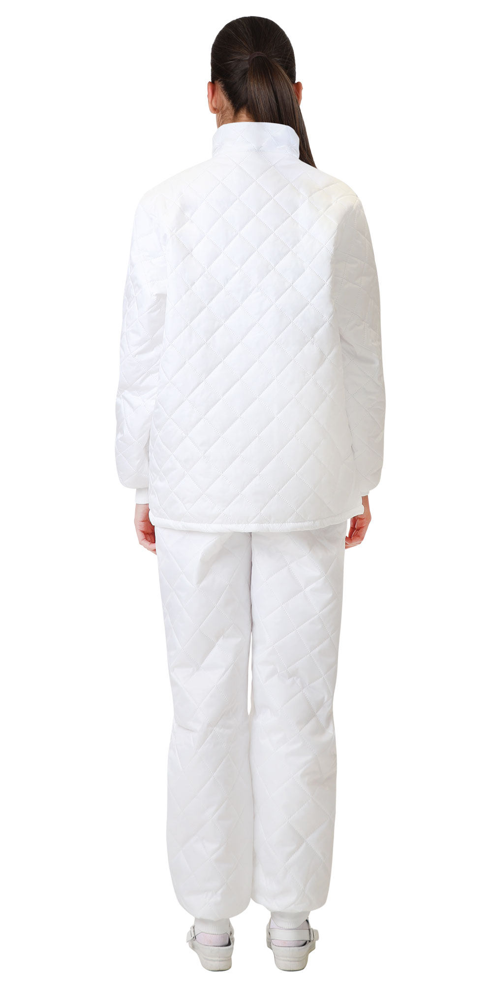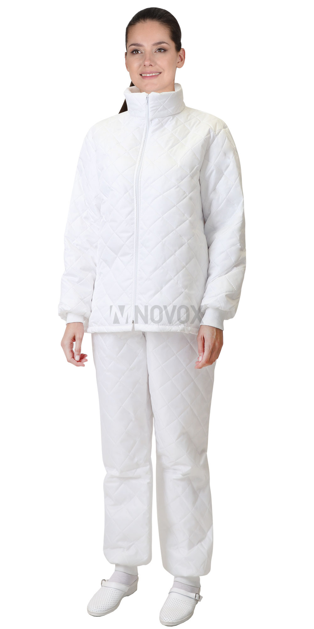 Куртка утеплённая прямого силуэта с центральной бортовой застёжкой на тесьму «молния». Выполнена из спаянного с утеплителем в виде ромбиков полотна, на притачной подкладке. Воротник стойка. Втачные длинные рукава с трикотажными манжетами. Внутренний накладной карман.