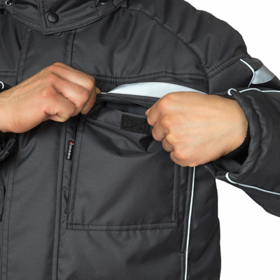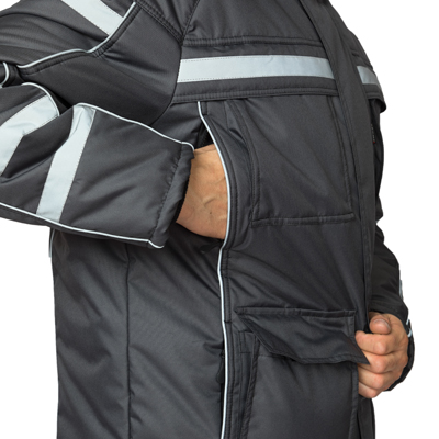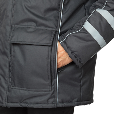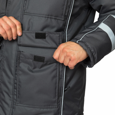 Куртка: мужская, удлинённая, прямого силуэта, с притачной утеплённой подкладкой, с центральной застёжкой на двухзамковую молнию, закрытую ветрозащитной утеплённой планкой с застёжкой на кнопки и контактные ленты. Центральная планка по горловине застёгивается на 2 кнопки. С внутренней стороны по правому борту закреплена дополнительная утеплённая ветрозащитная планка. Воротник-стойка, утеплённый, внутренний воротник выполнен из флиса. Рукава реглан, с внутренними трикотажными манжетами. Объём по линии талии регулируется с помощью внутренней кулиски с шнуром и фиксаторами.
