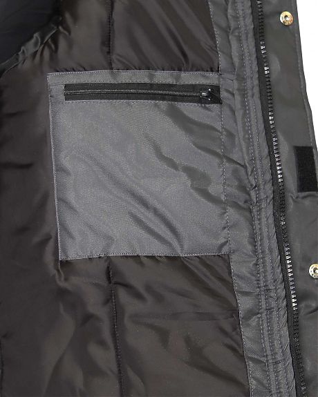 Куртка утеплённая, удлинённая, прямого силуэта, с втачным воротником стойка, со съемным капюшоном, с центральной бортовой застёжкой на 2-х замковую тесьму «молния» от края воротника, молния накрыта ветрозащитной планкой из ткани отделка. Куртка с втачными рукавами с внутренней трикотажной манжетой. Куртка простёгана горизонтальными строчками с утеплителем, куртка с притачной утеплённой подкладкой, с внутренней подпланкой из ткани отделка, в шве притачивания молнии с правой стороны. Для обеспечения сигнальной видимости в куртке предусмотрены кант готовый СВМ 3мм светоотражающий 100К и лента светоотражающая ш.50мм.