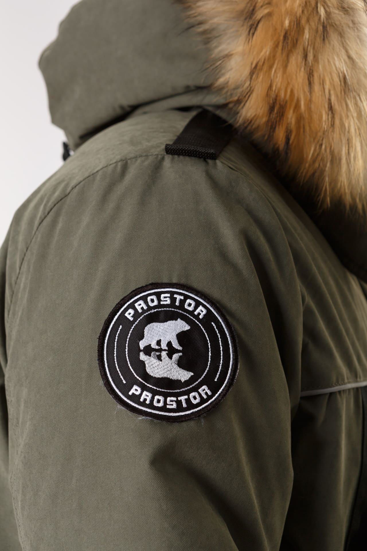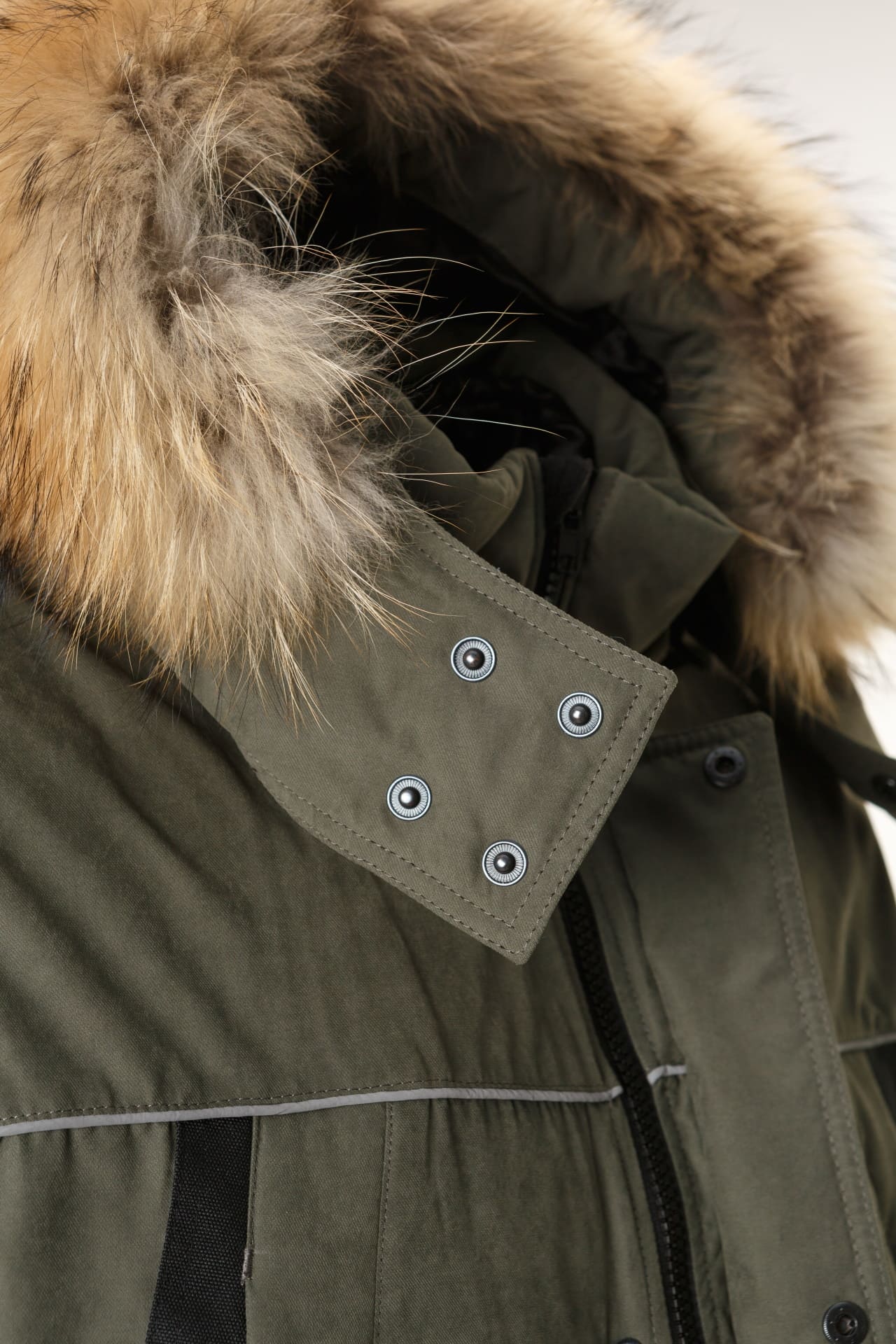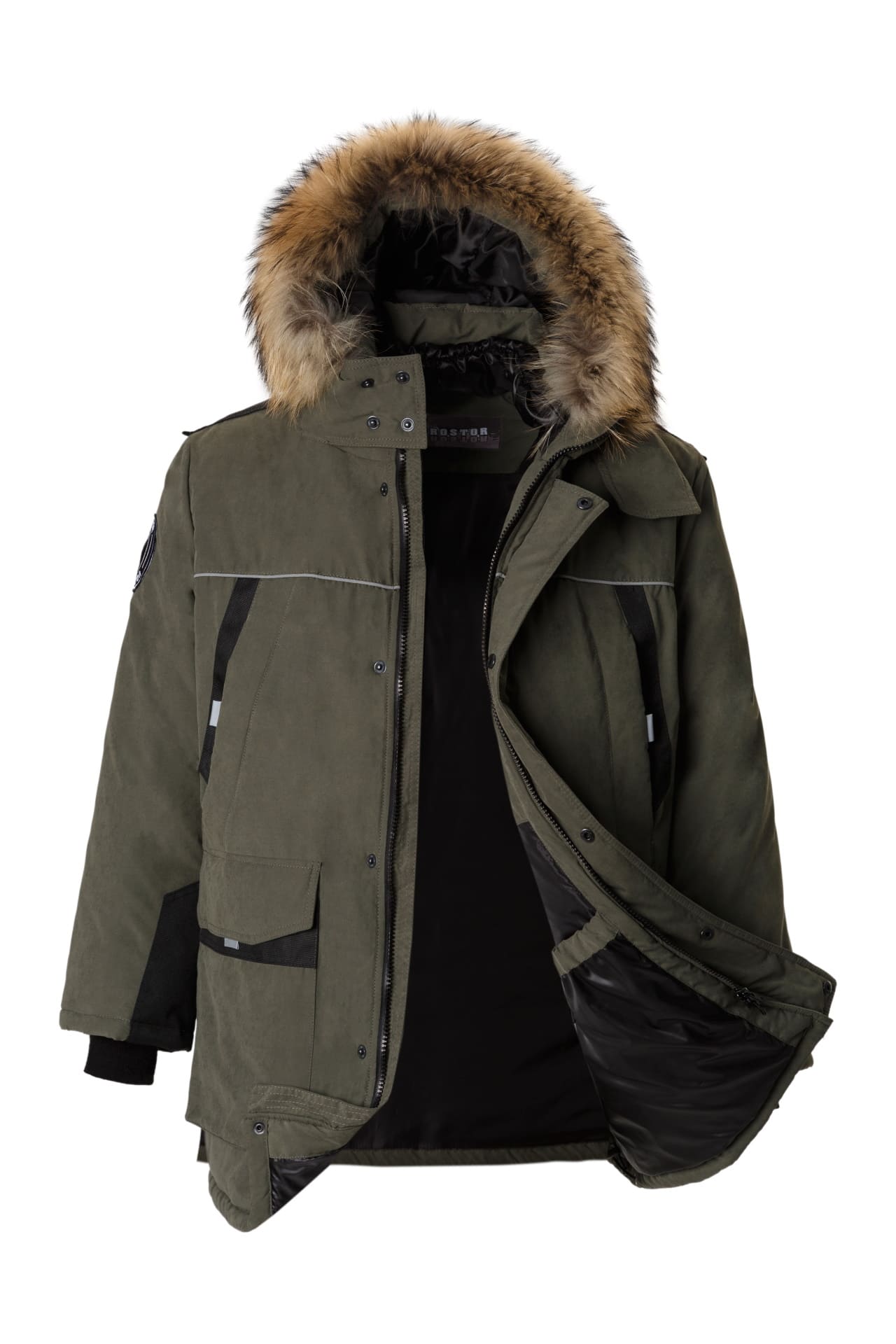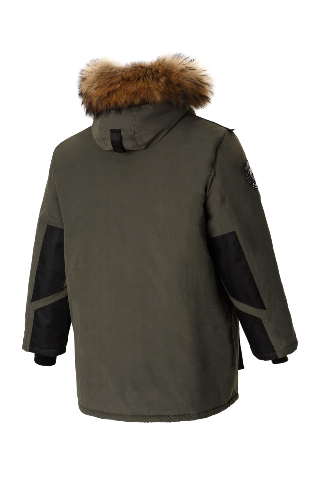 - Съемный объемный капюшон с опушкой из натурального меха енота. Объем капюшона регулируется, что дает возможность надевать каску под капюшон.