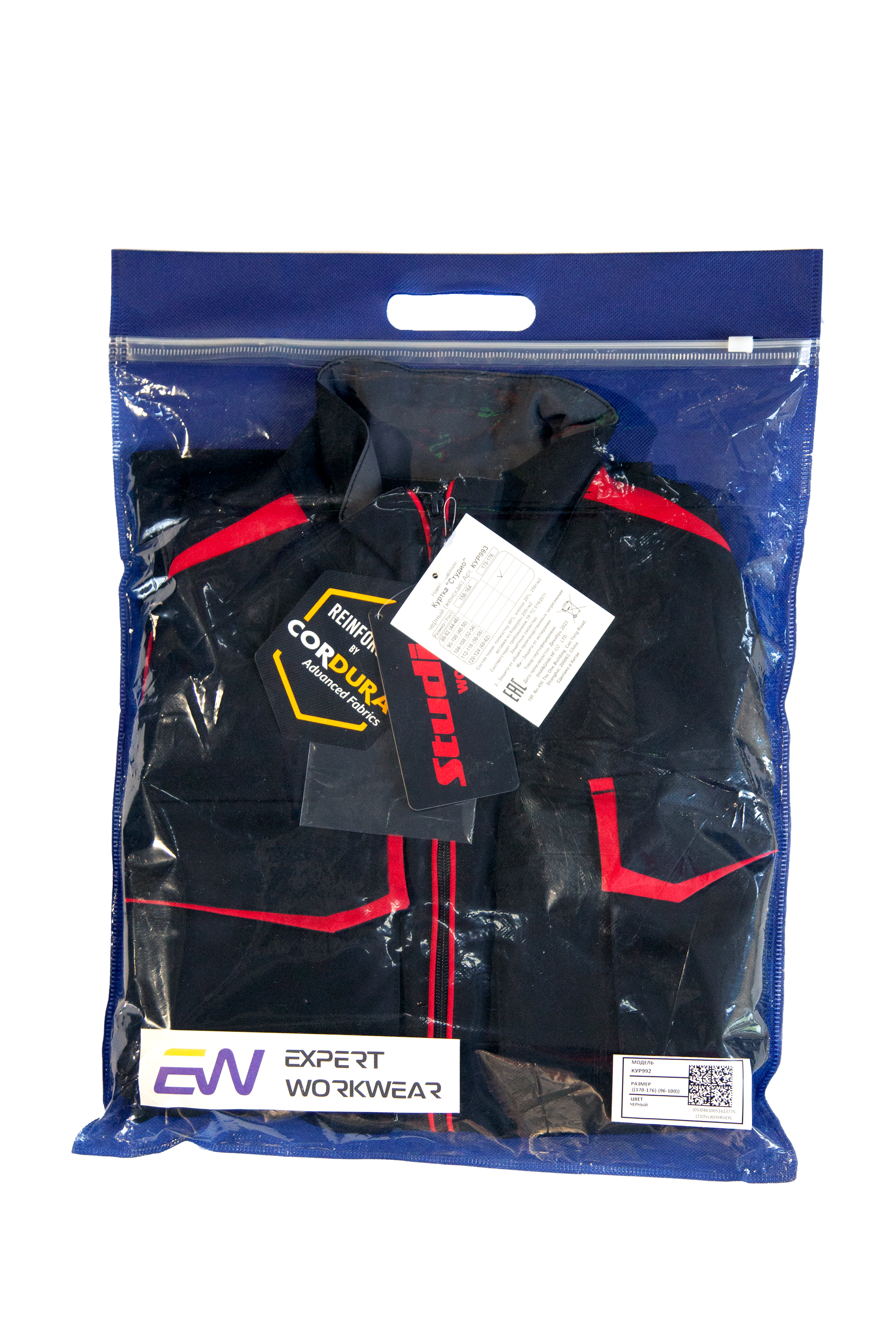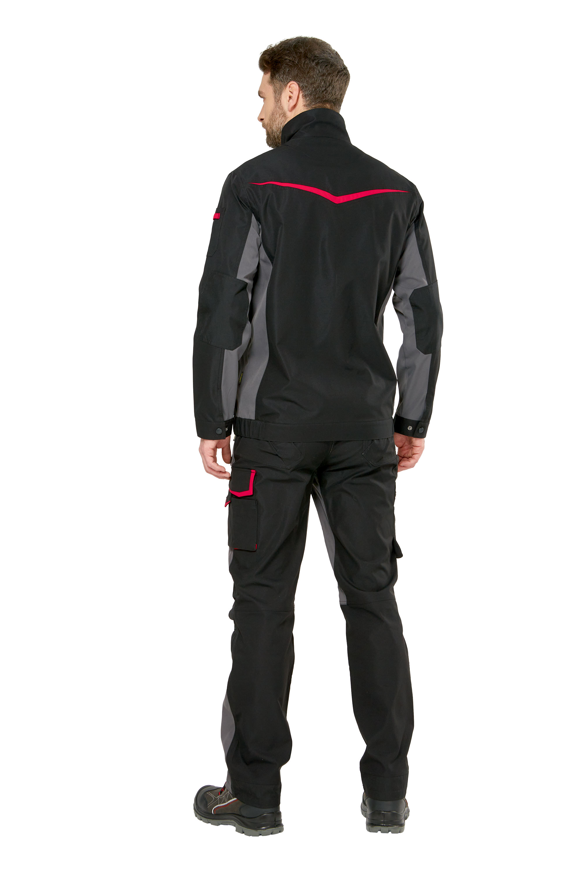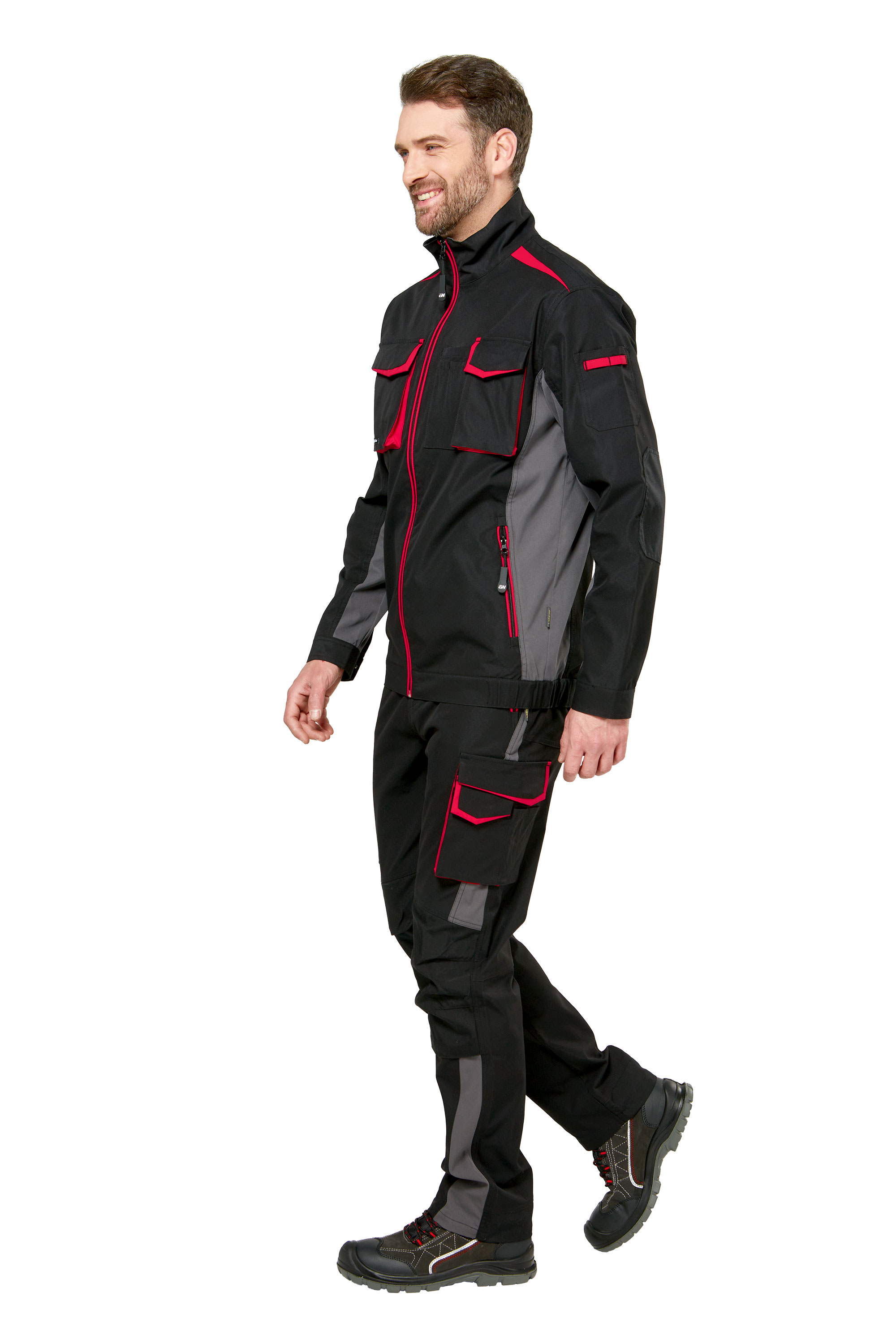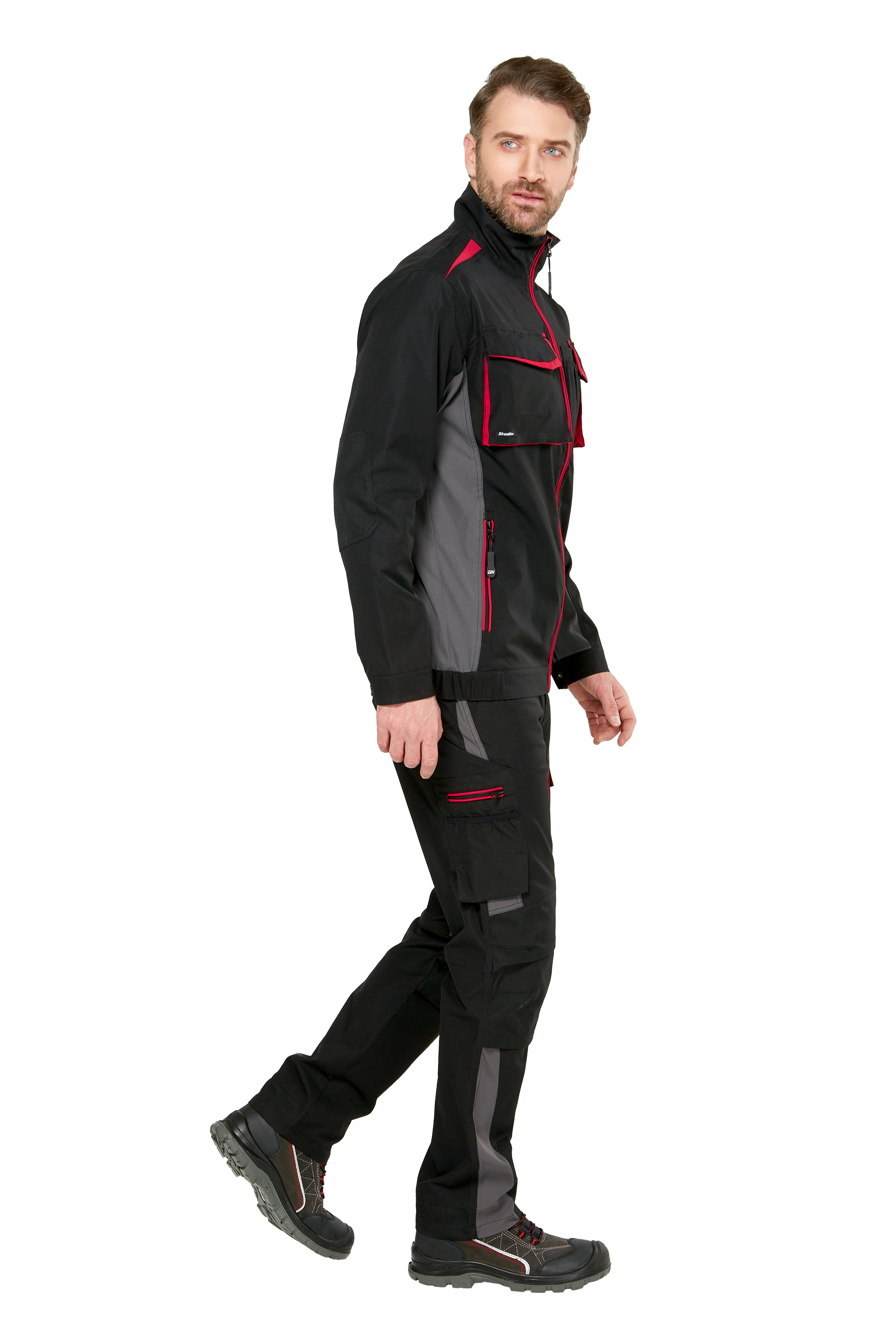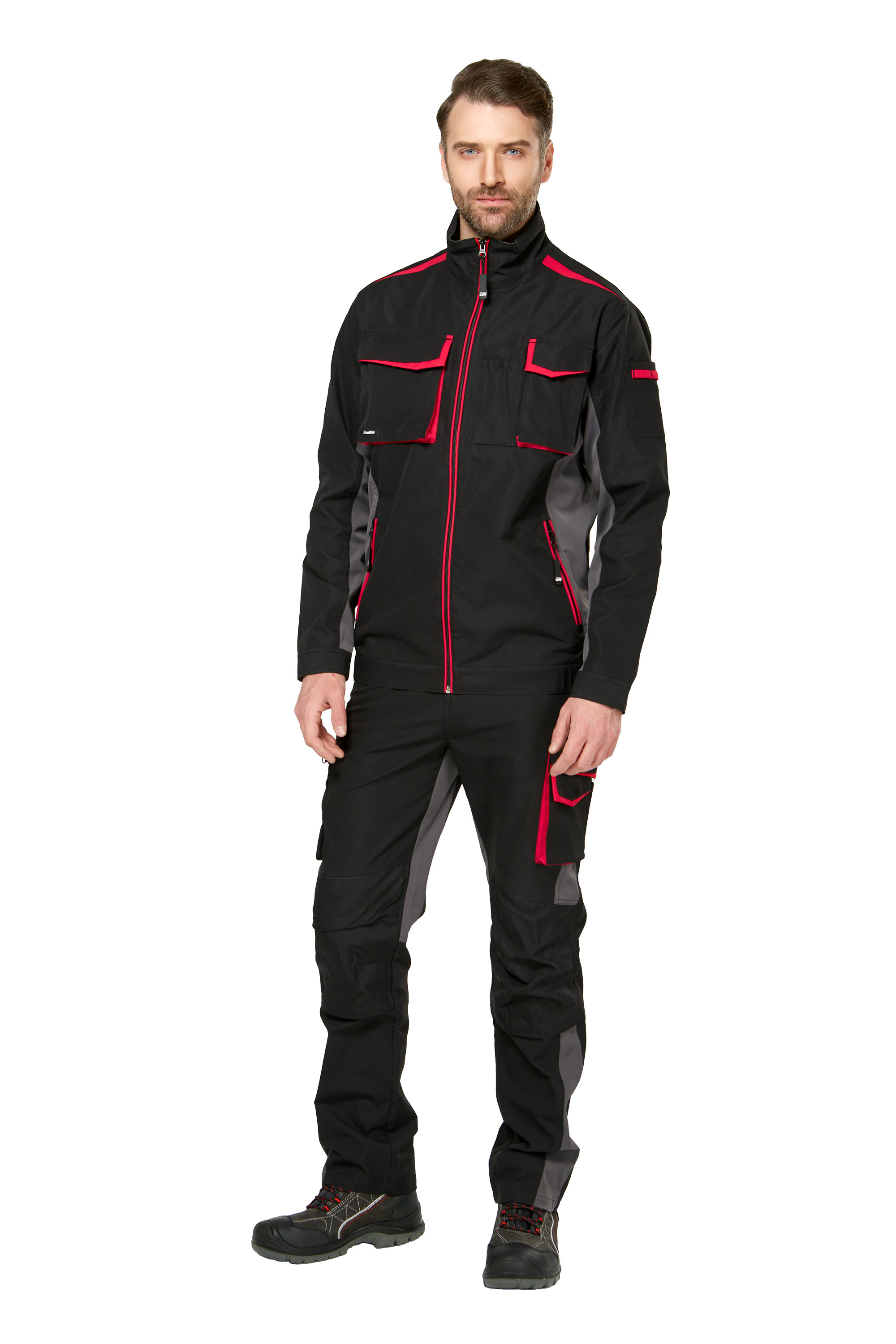 Куртка летняя и демисезонная мужская из плотной смесовой ткани черного цвета в сочетании с контрастными красными вставками и сегментами из ткани серого цвета, для защиты от общих производственных загрязнений и механических воздействий (истирания).