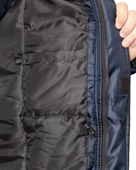 Куртка длинная прямого силуэта с притачной утеплённой подкладкой; с центральной застёжкой на двухзамковую тесьму — «молния» до верха; с воротником-стойка; с внешней ветрозащитной планкой застегивающиеся на потайные текстильные застежки лента «контакт» 3 шт. длиной 4,0см; нижними накладными карманами с утепленными клапанами на ленте «контакт». В куртке предусмотрена лента светоотражающая (серая) шириной 50мм для обозначения сигнальной видимости.