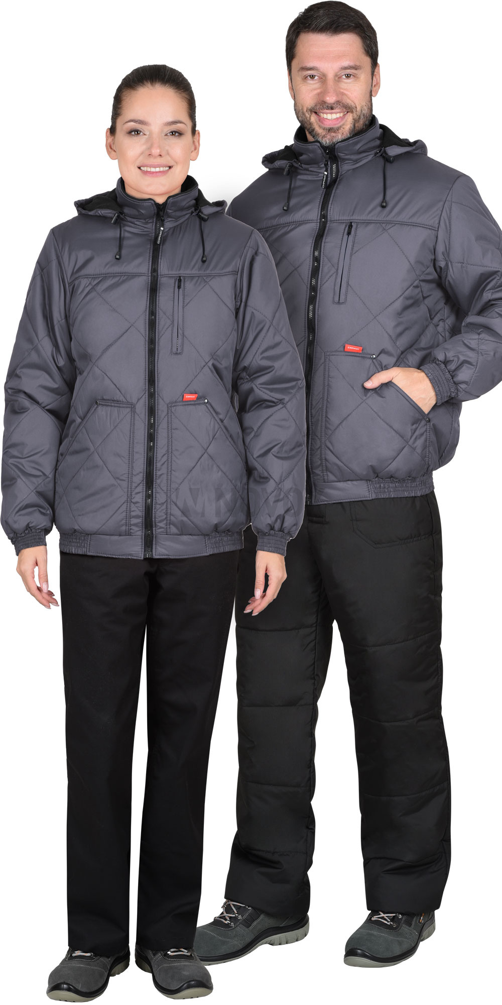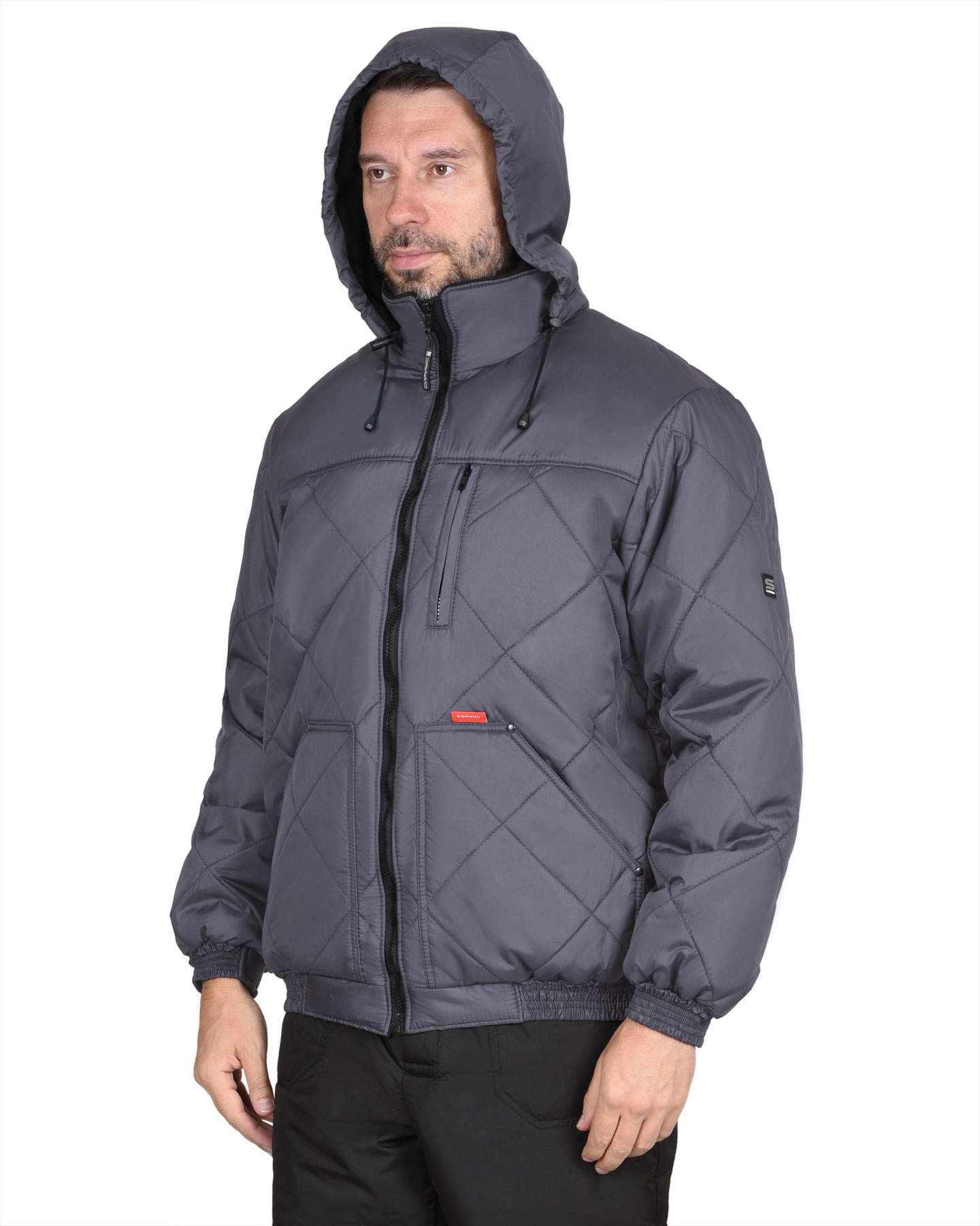 Куртка утеплённая, укороченная, по низу с поясом частично сосборенным на резинку, воротником стойка, центральной застёжкой молния от края воротника до низа куртки, верхним нагрудным прорезным карманом с молнией и нижними накладными карманами, съёмным капюшоном, втачными рукавами с манжетами, частично сосборенными на резинку. Куртка и капюшон на подкладке из флиса, на подкладке куртки с правой стороны накладной карман. Полочки, спинка, рукава и нижние карманы куртки выстеганы в виде ромбов.