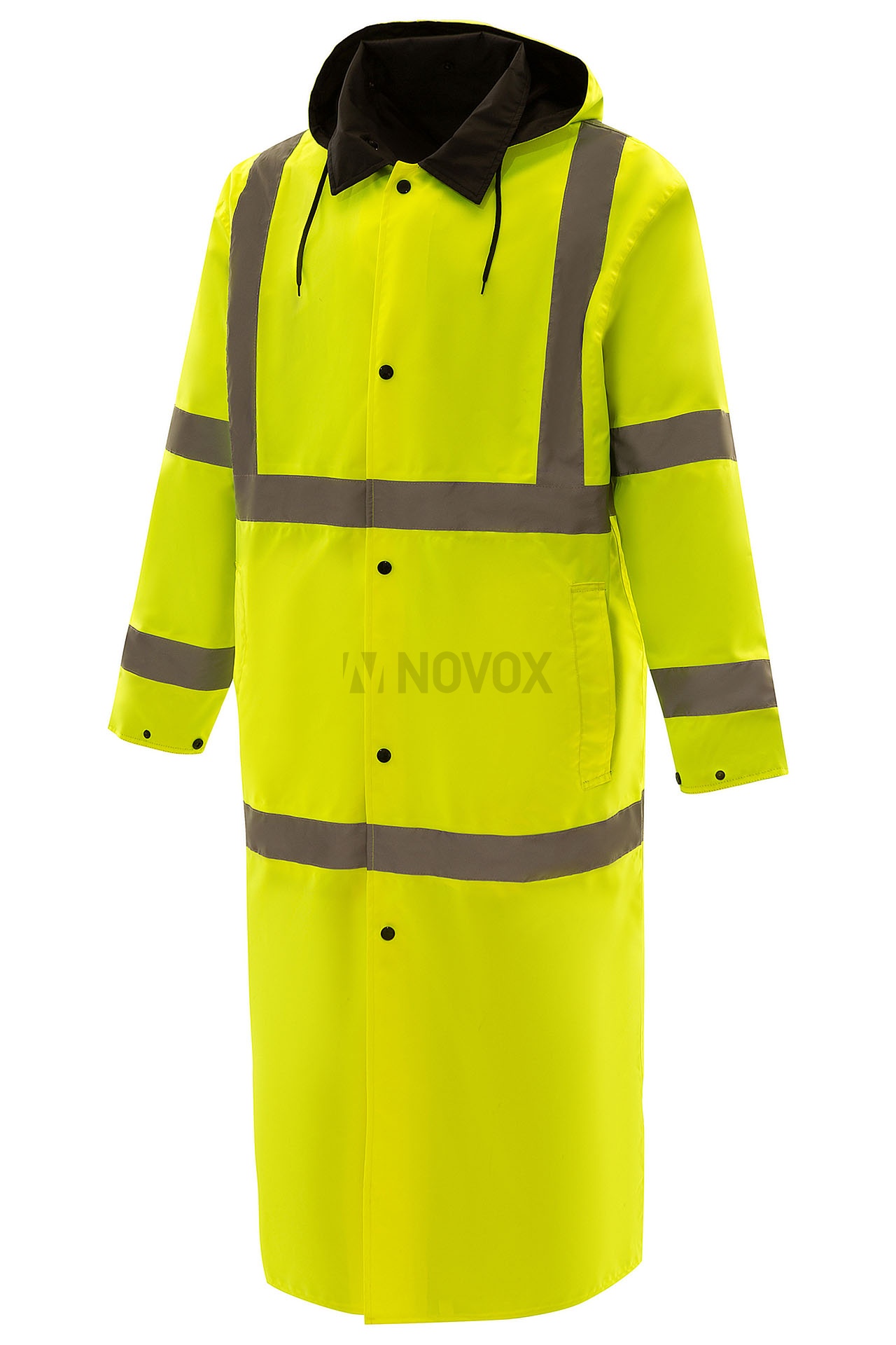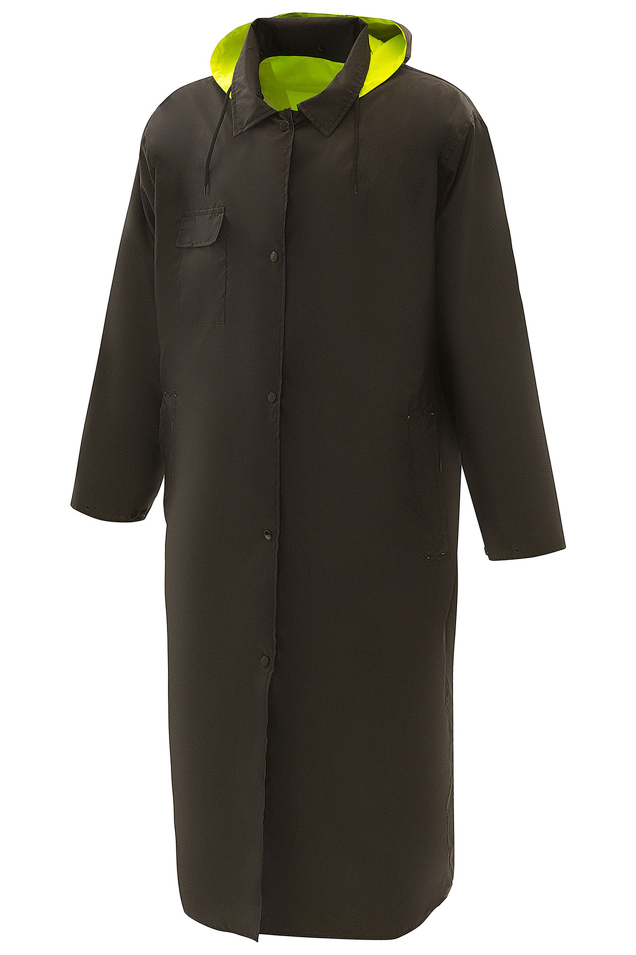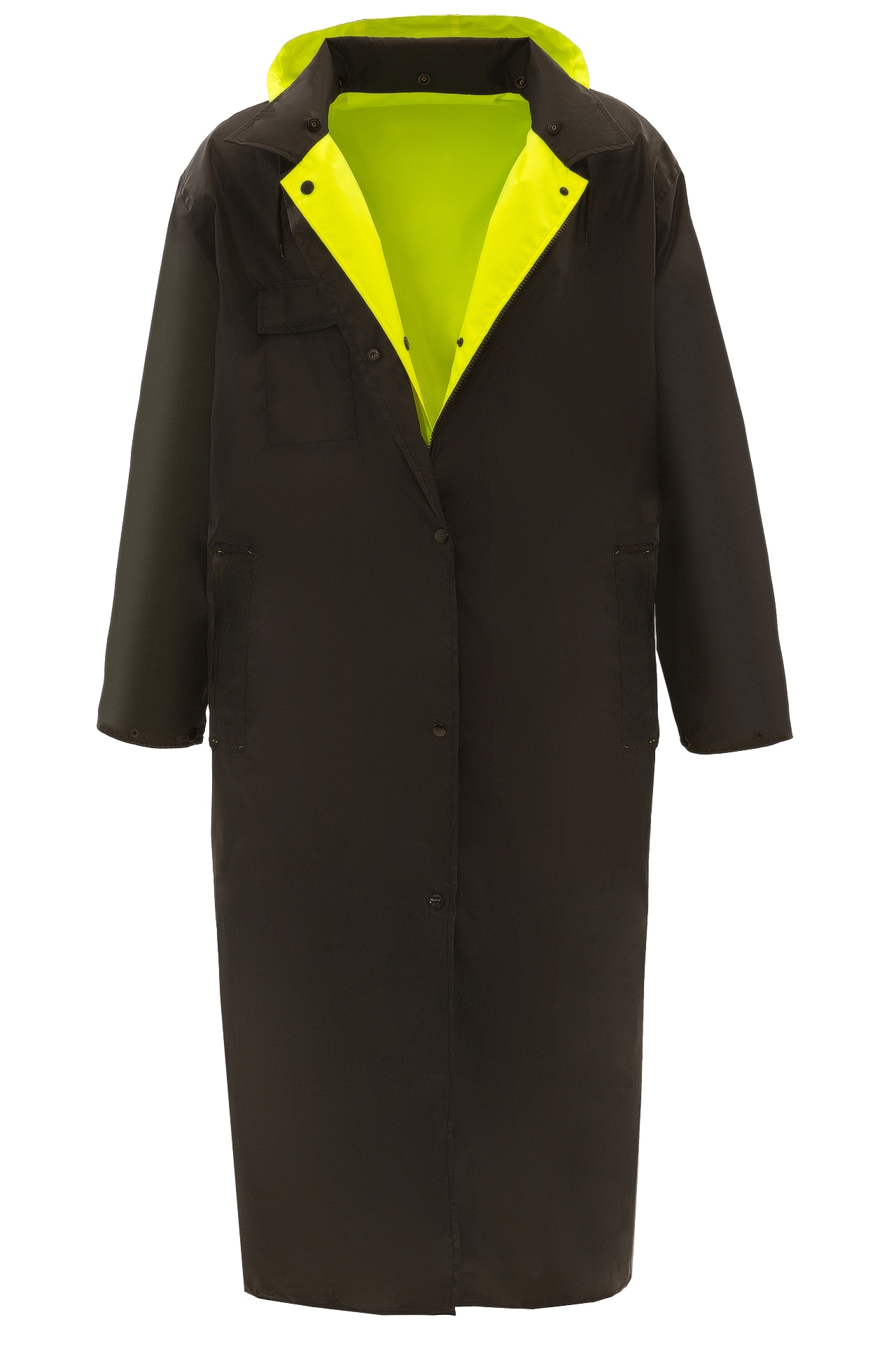 Влагозащитный двухсторонний плащ повышенной видимости из ткани ярко-лимонного флуоресцентного цвета со светоотражающими полосами, соответствует 3 классу по ГОСТ Р 12.4.281-2021 и обратной стороной нейтрального чёрного цвета.