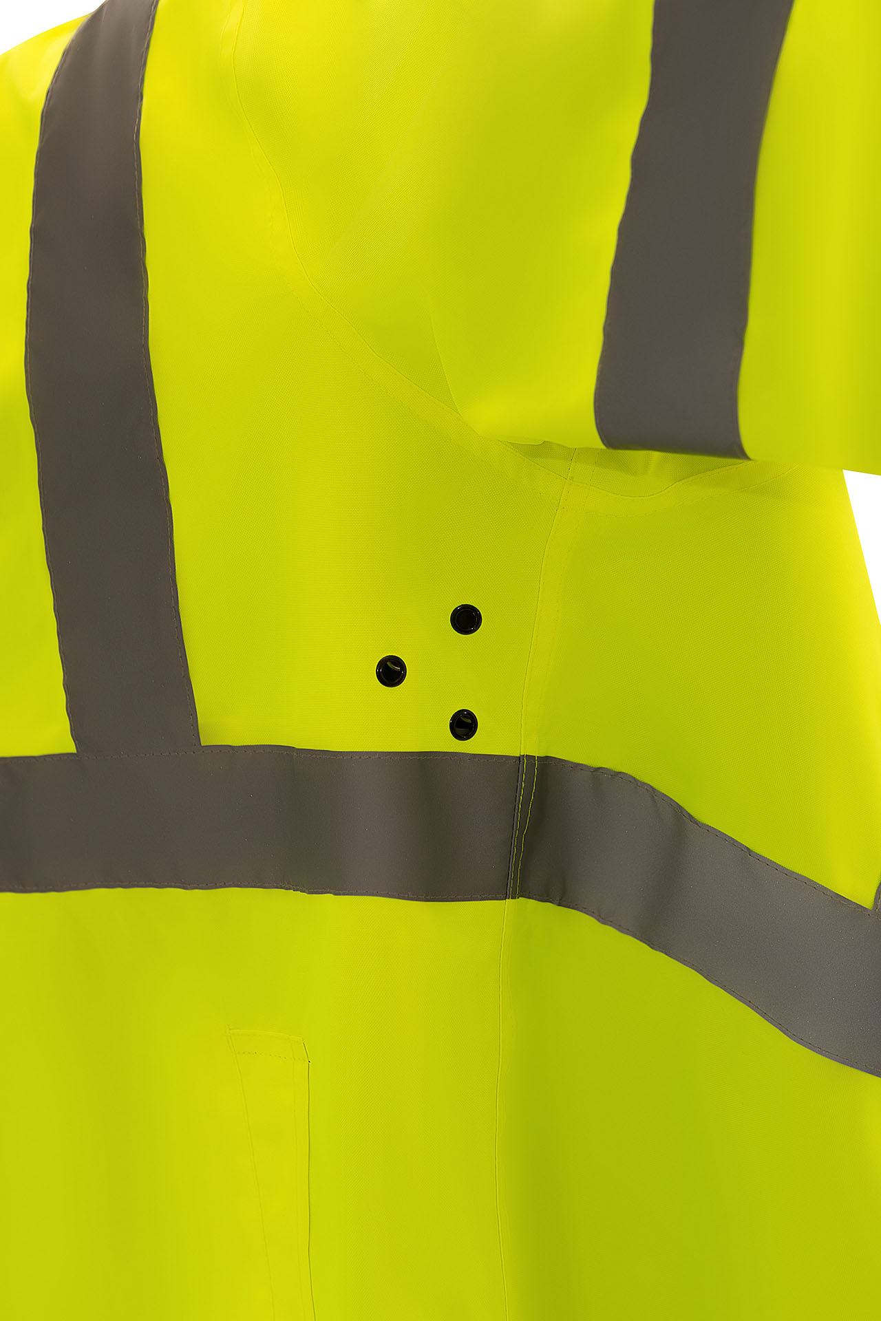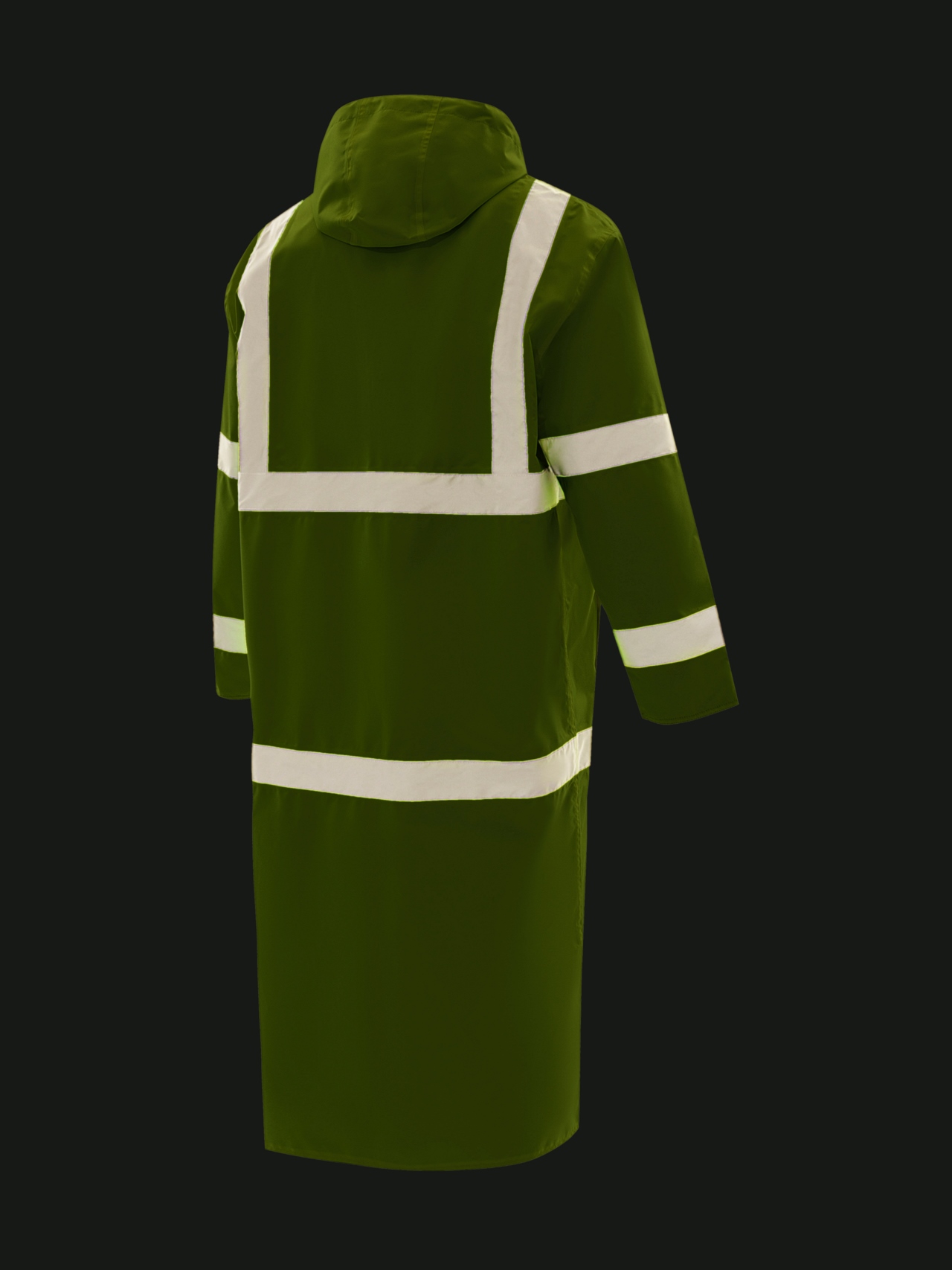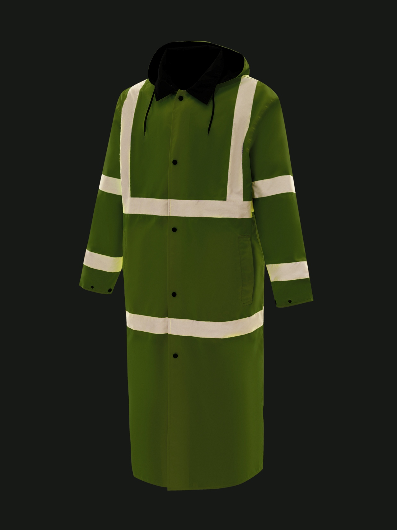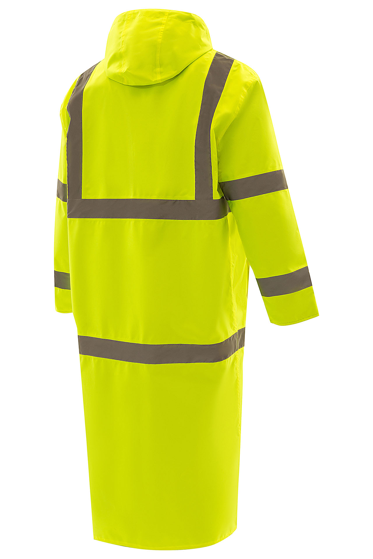 Влагозащитный двухсторонний плащ повышенной видимости из ткани ярко-лимонного флуоресцентного цвета со светоотражающими полосами, соответствует 3 классу по ГОСТ Р 12.4.281-2021 и обратной стороной нейтрального чёрного цвета.