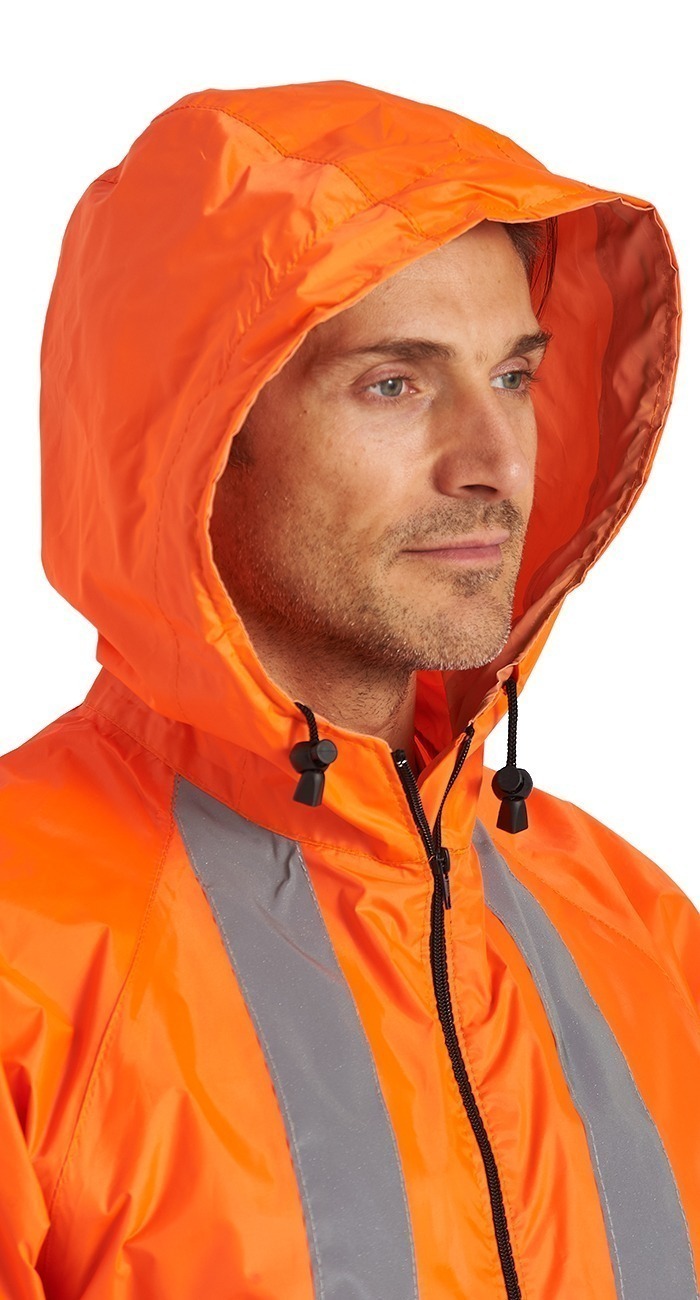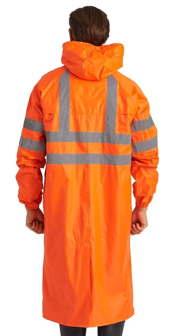 - Плащ изготавливается из ткани ярко-оранжевого и ярко-лимонного цветов. Имеет светооражающие полосы. Соответствует 3-му классу по ГОСТ Р 12.4.219-99 «Одежда специальная сигнальная повышенной видимости».