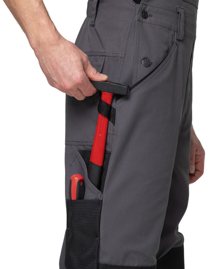 Карманы: два передних боковых кармана с наклонным входом; нагрудник с двойным накладным карманом, часть кармана с клапаном на контактной ленте; нижний карман разделен на три отделения; в правом — петля с полукольцом для крепления бейджика; внутри накладного кармана карман для мобильного устройства; два задних накладных кармана с фигурными клапанами с застежкой на контактную ленту, с правой стороны вставлена стропа; многофункциональные набедренные карманы: слева — накладной объемный карман, с малым накладным карманом; справа — накладной карман для инструментов с косым входом, на него сверху настрочен малый карман для инструментов.