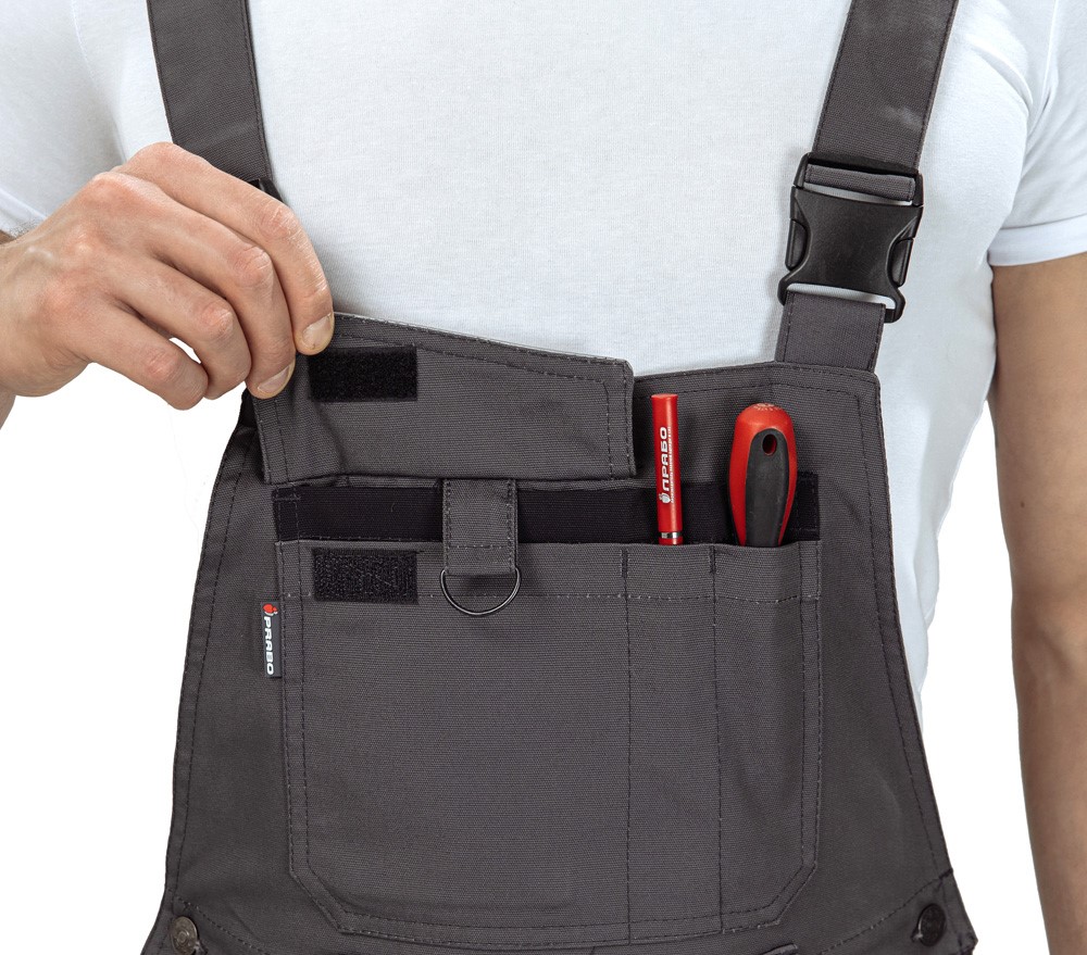 Мультифункциональный полукомбинезон "Сюрвейер" премиум-уровня. Анатомический крой выполнен с учётом особенности механики тела при работе и не стесняет движений. Полукомбинезон сшит из плотного материала, в котором преобладает хлопок и содержится полиэфир. Усилительные анатомические накладки выполнены в виде карманов для возможности размещения амортизационных вкладышей-наколенников. Область колена усилена вторым слоем ткани, общая плотность составляет 590 г/м², что гарантирует высокую степень защиты коленного сустава, а также обеспечивает высокое сопротивление на разрыв и стойкость к истиранию. А усиление по низу брючин вторым слоем ткани "Кордура" шириной 70 мм является хорошей защитой от случайных порезов об острые предметы или детали обуви.