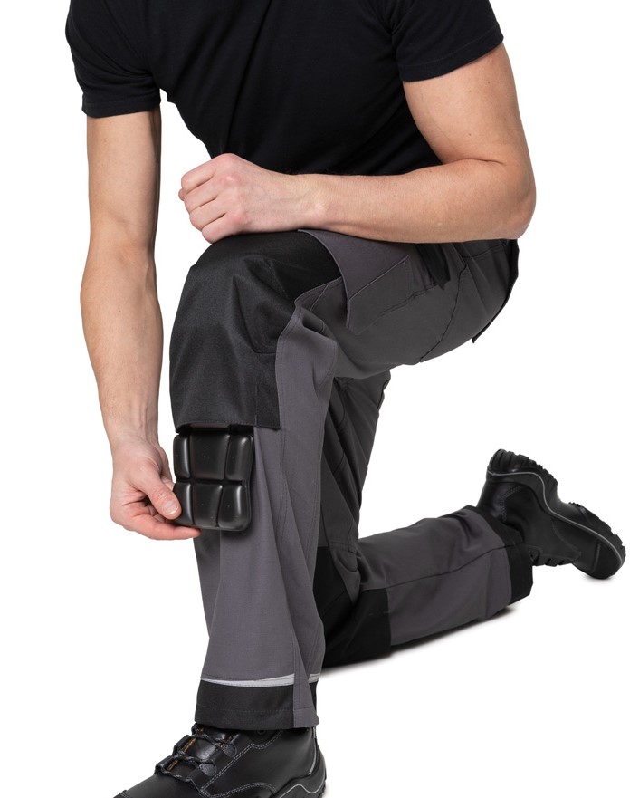 Усилительные элементы: объёмные наколенники с карманами для амортизационных накладок, наколенники с анатомическими вытачками; по низу брючин усилительные детали; закрепки; двойные строчки.