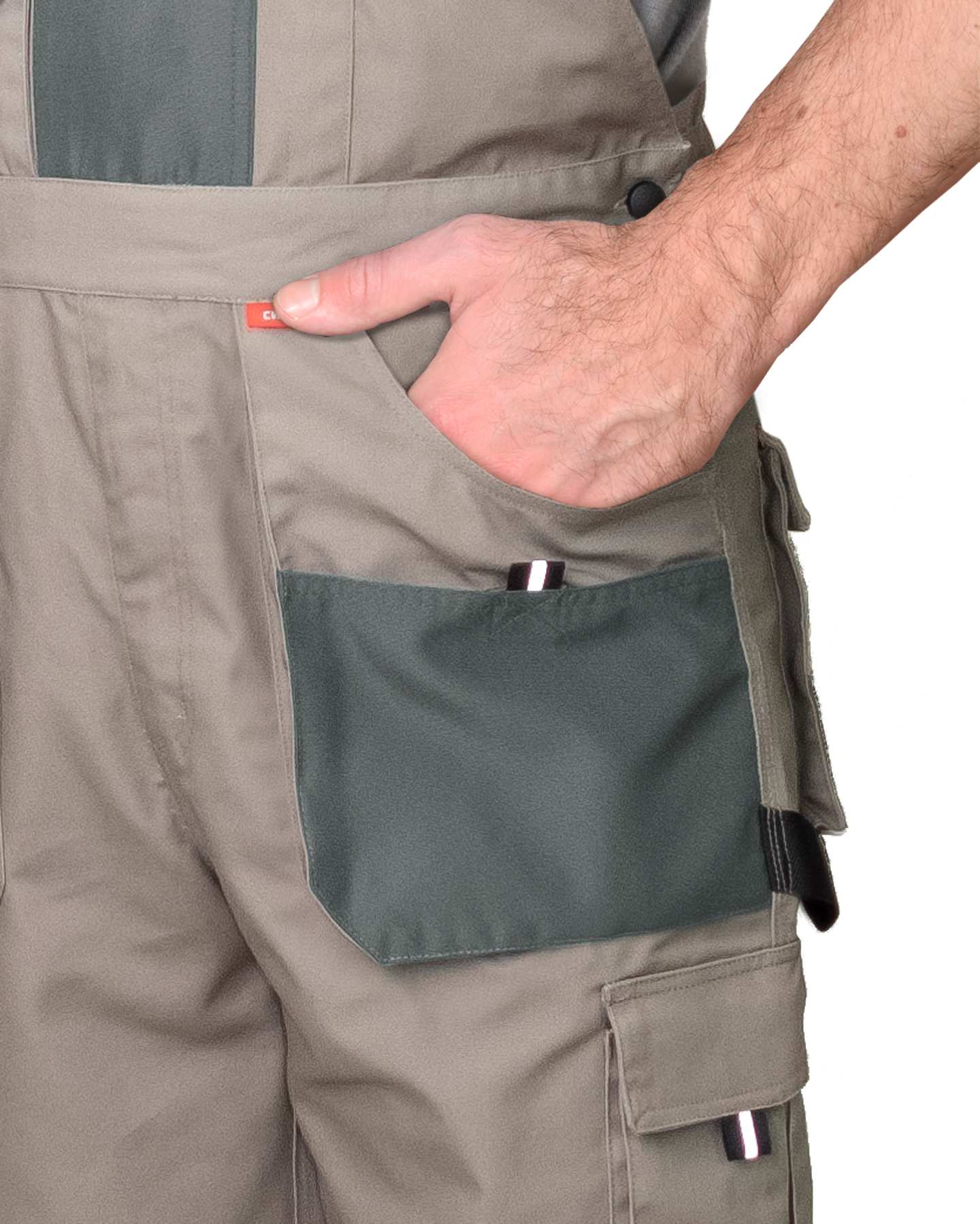 Полукомбинезон прямой с застёжкой в боковых швах на пуговицы и в среднем шве передних половинок на гульфик с молнией, с наколенниками, с бретелями. Полукомбинезон с накладными карманами спереди и сзади и на левом боковом шве, с объёмными наколенниками из плотной, непромокаемой ткани с нижним входом для амортизационного вкладыша. Бретели регулируются при помощи застежек-фастексов и резинки.