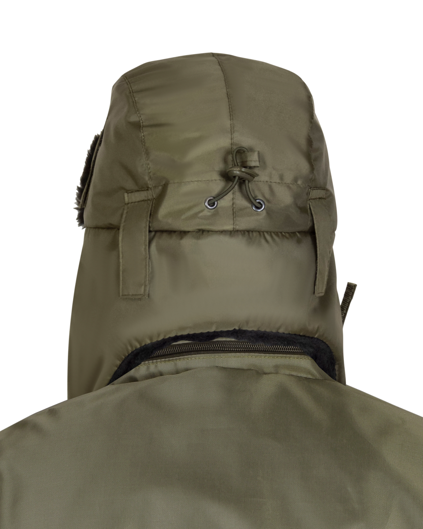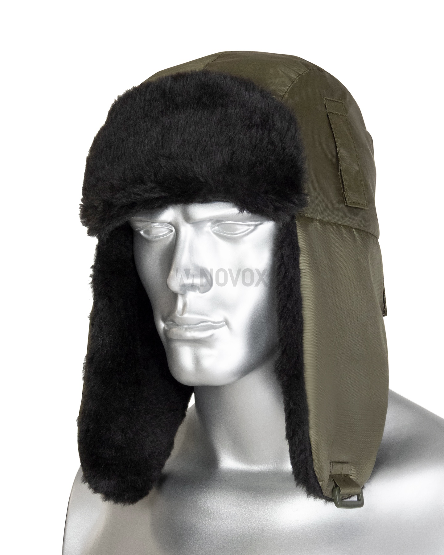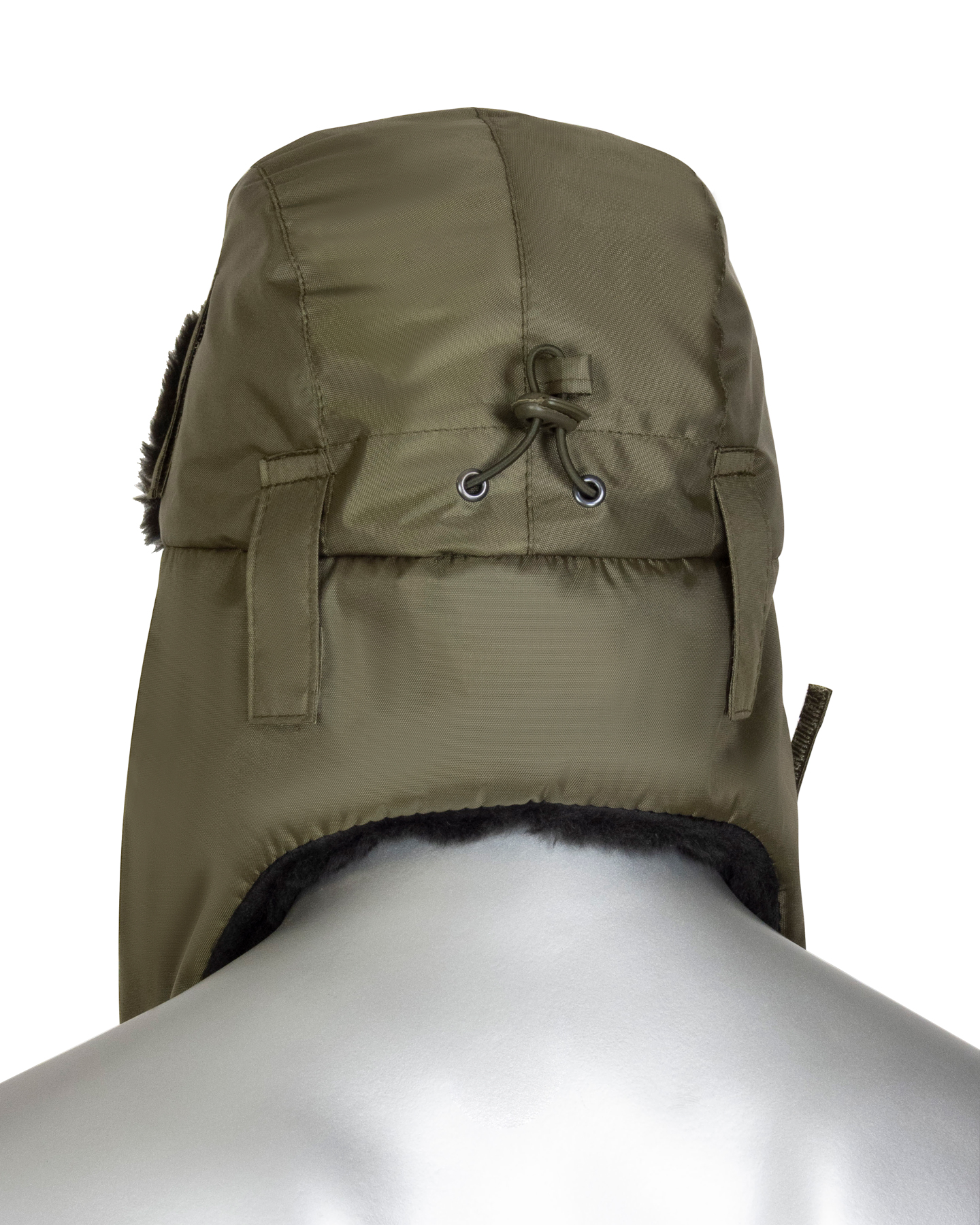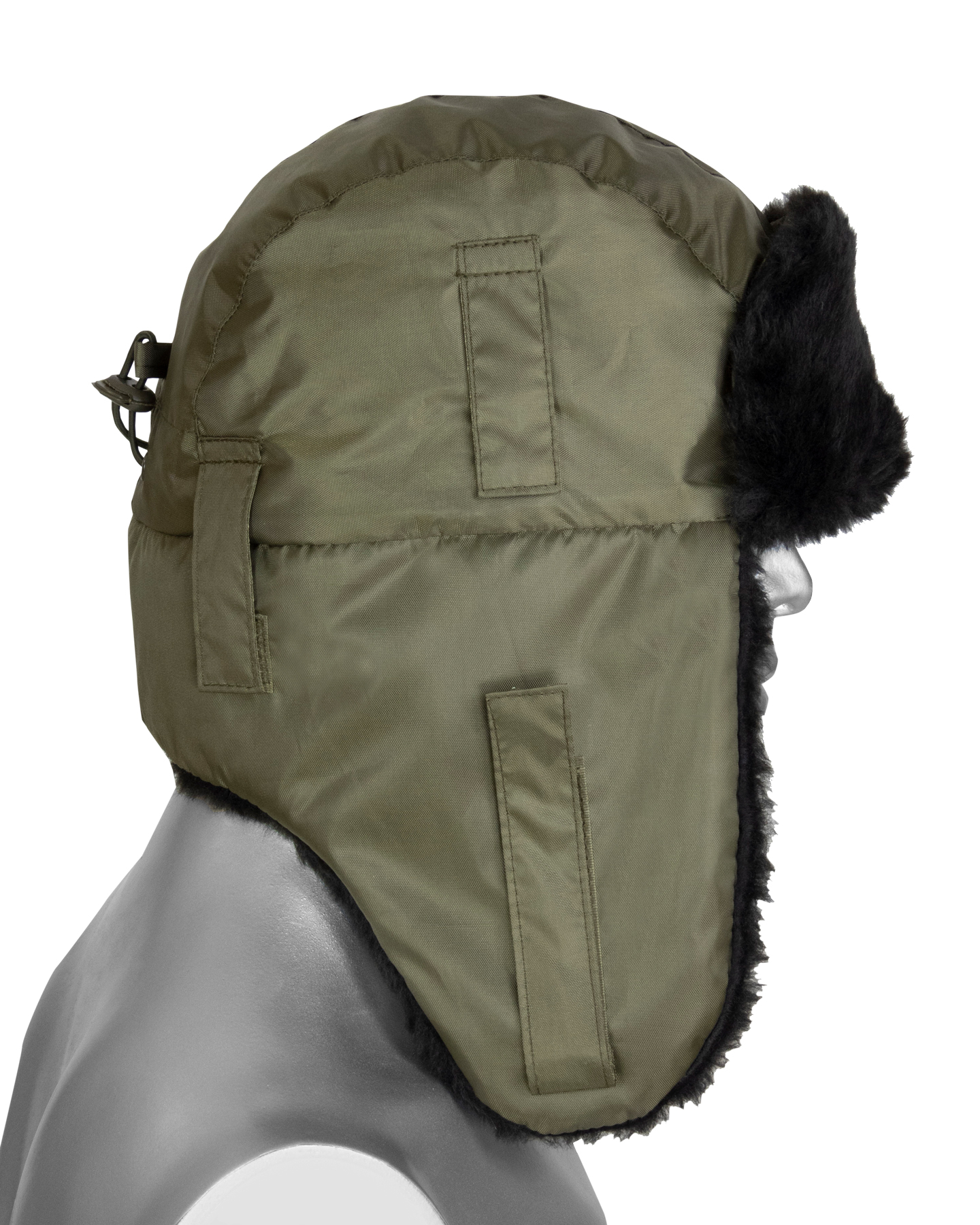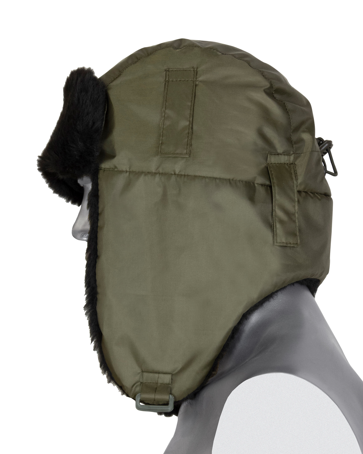 Шапка-ушанка зимняя хаки с искусственным мехом черного цвета. На затылочной части резинка для более плотного прилегания к голове. На боковых частях шлевки для крепления каски.