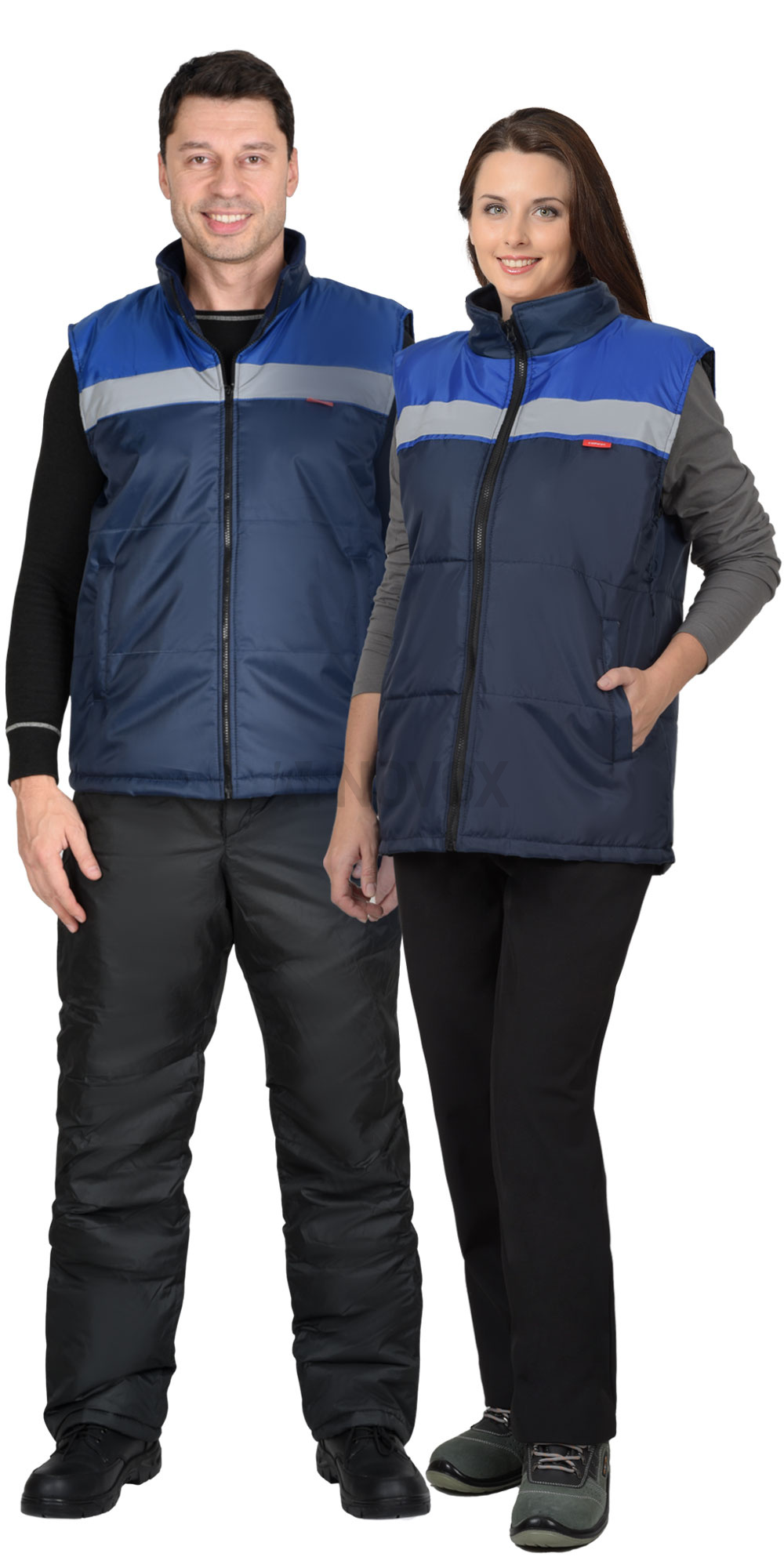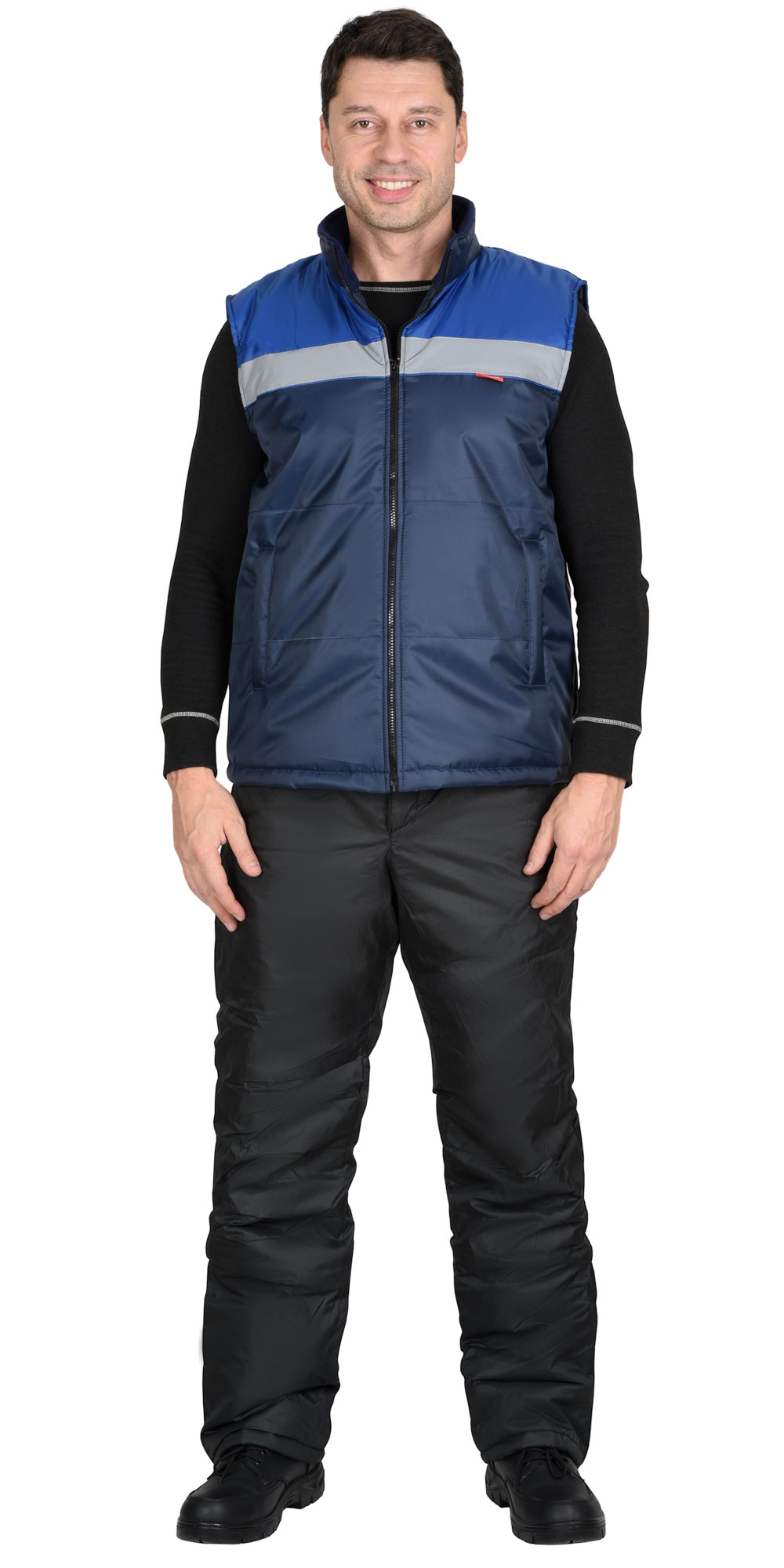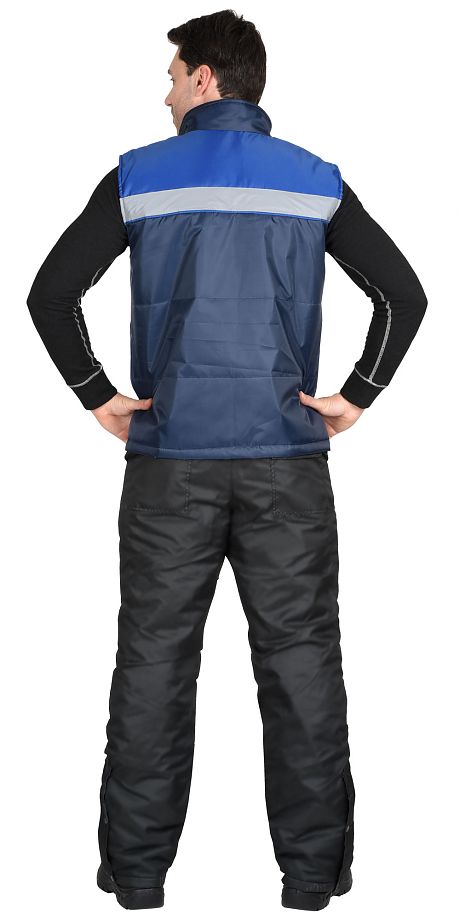 Жилет прямого силуэта, утеплённый, с притачной подкладкой, с центральной застёжкой на тесьму - "молния", с воротником стойка, с прорезными карманами с "листочкой" с втачными концами, с наклонным входом. Ткань верха: Оксфорд, состав - 100 % п/э, пл. 150 г/м2, один слой. Цвет: темно-синий.