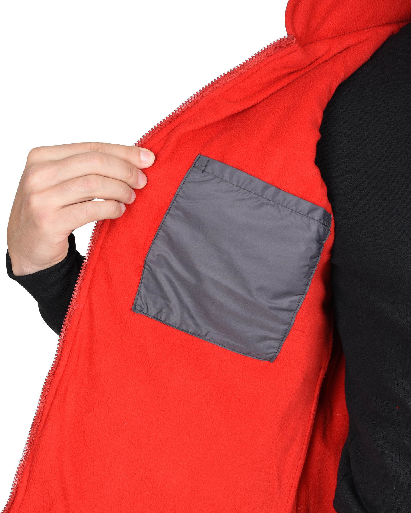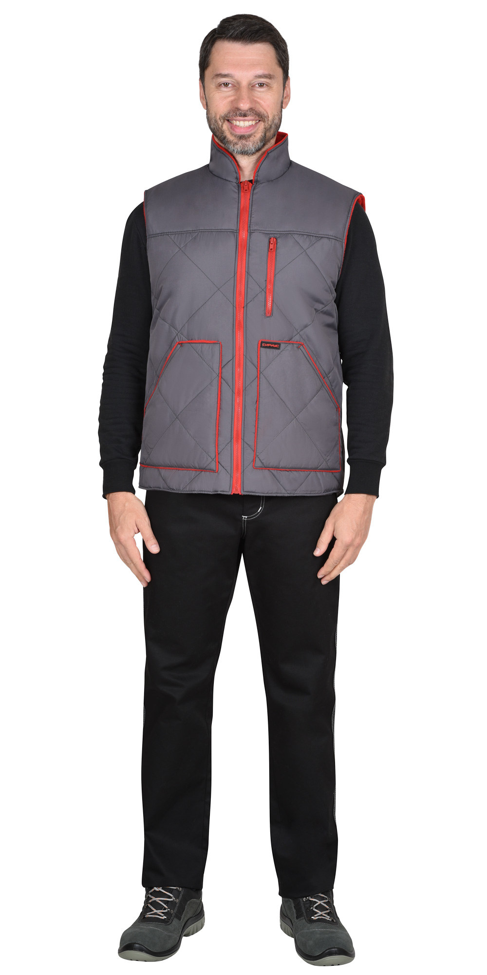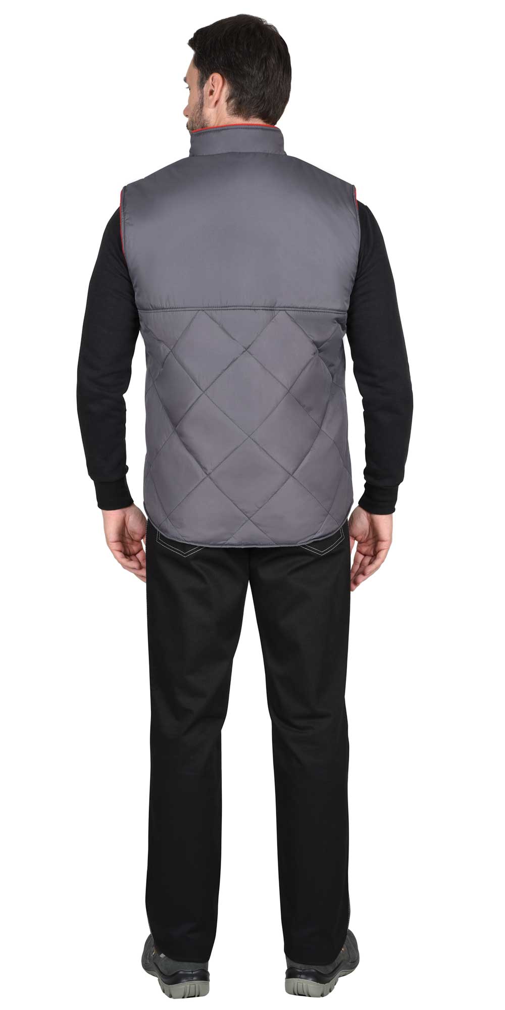 Жилет утеплённый, стёганный, прямого силуэта, на подкладке из флиса с центральной бортовой застёжкой на молнию, с воротником стойка, с нагрудным карманом с молнией и нижними фигурными утеплёнными карманами. Жилет с удлинённой спинкой. ГОСТ 25295-2003