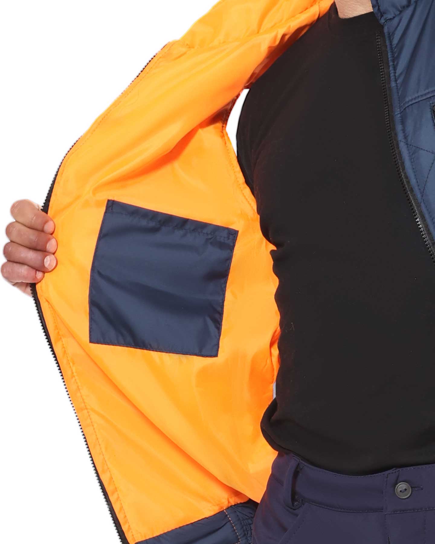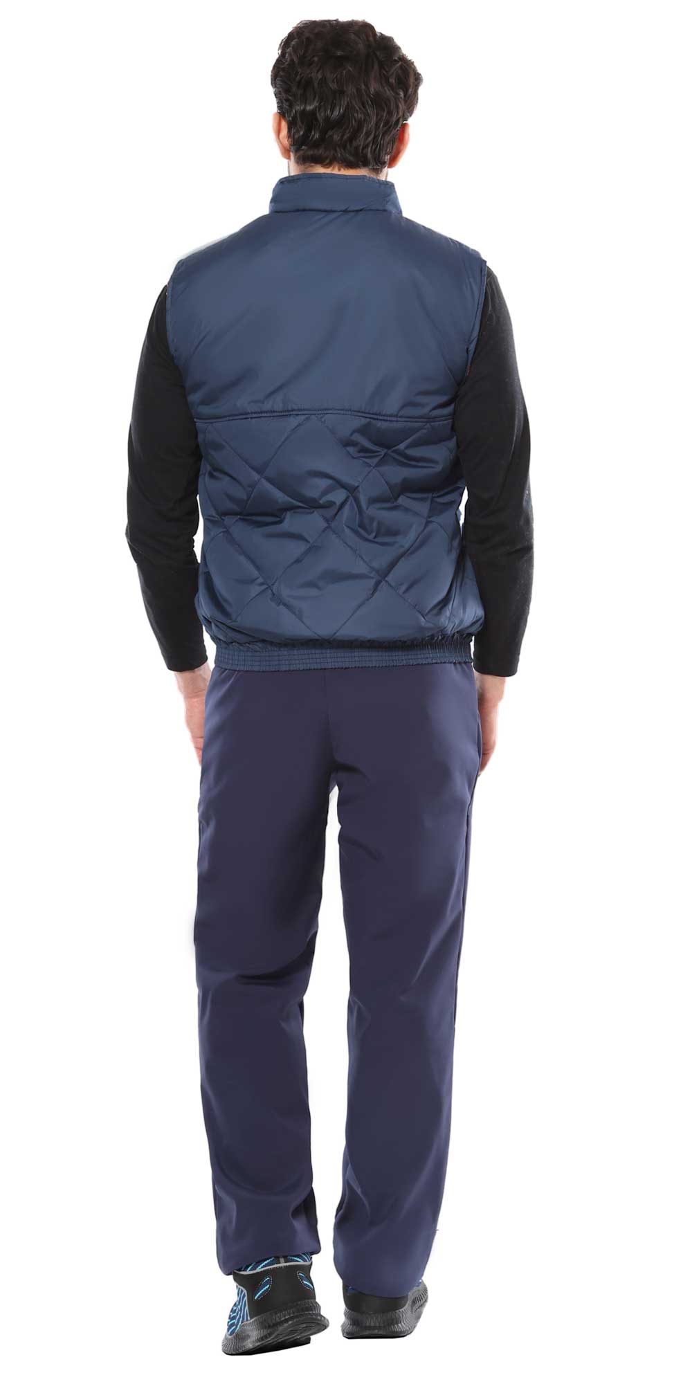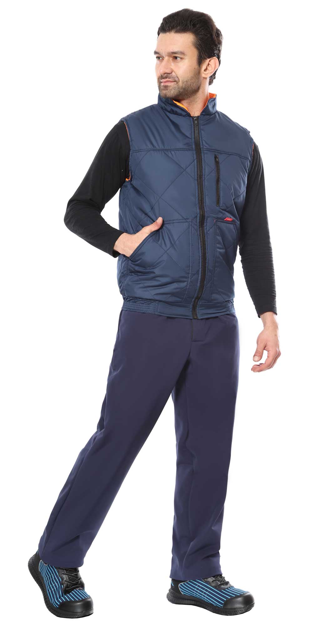 Жилет утеплённый, стёганый,с центральной бортовой застёжкой на молнию, с воротником стойка, с нагрудным карманом с молнией и нижними фигурными утеплёнными карманами. Жилет на притачном поясе стянутом резинкой. ГОСТ 25295-2003