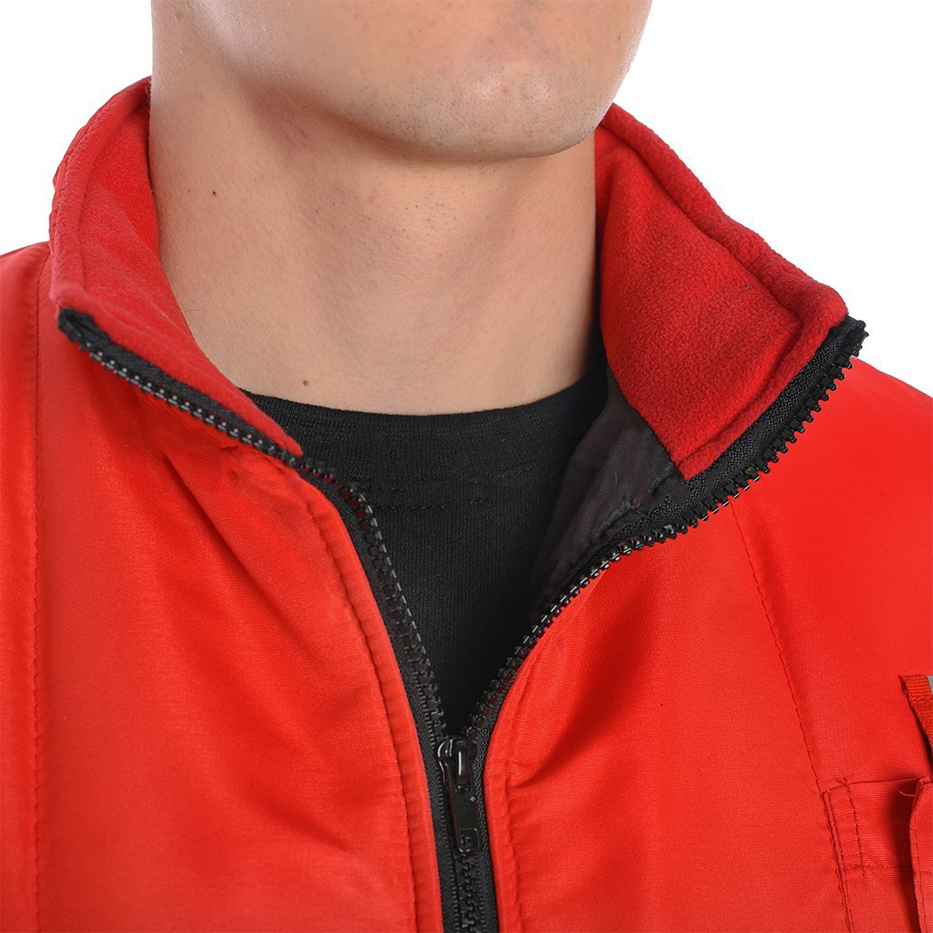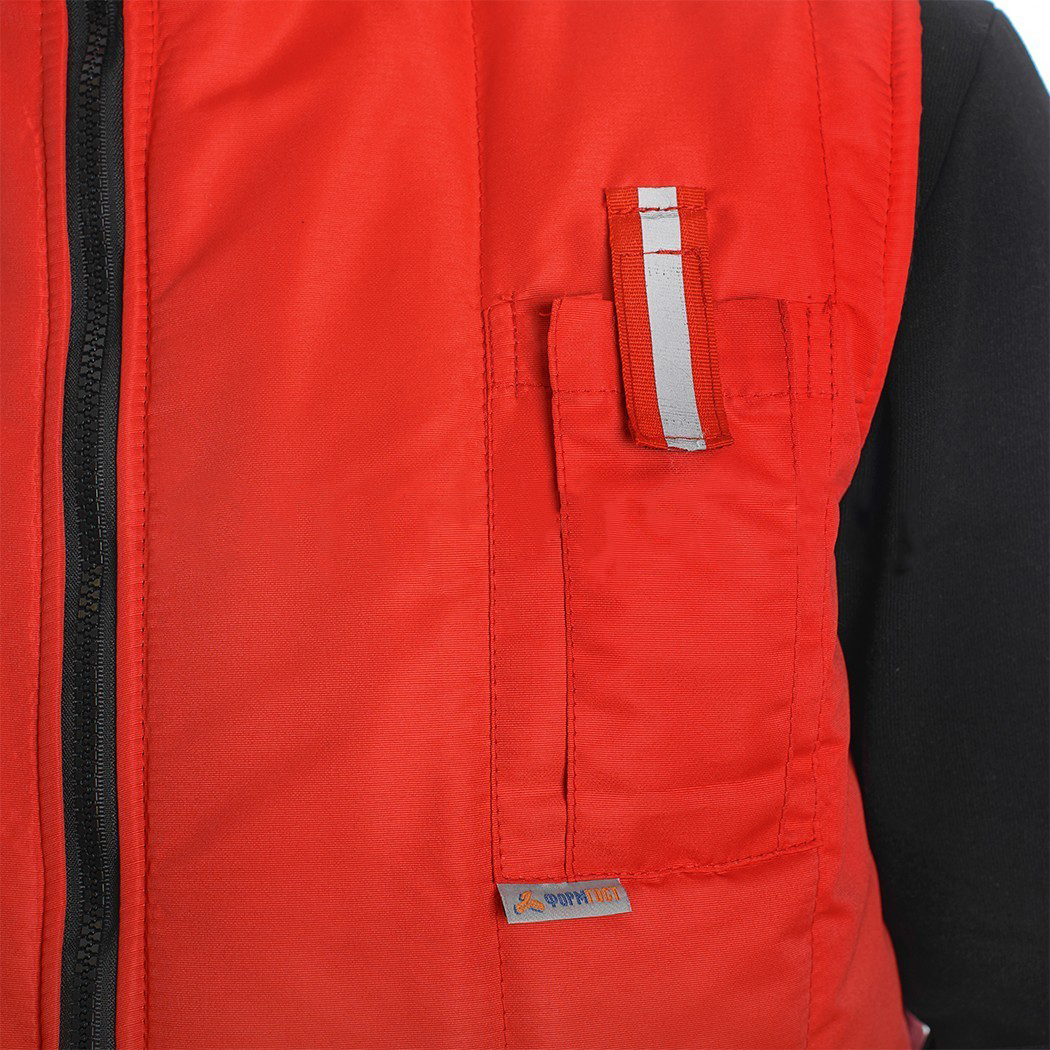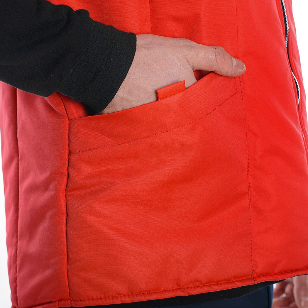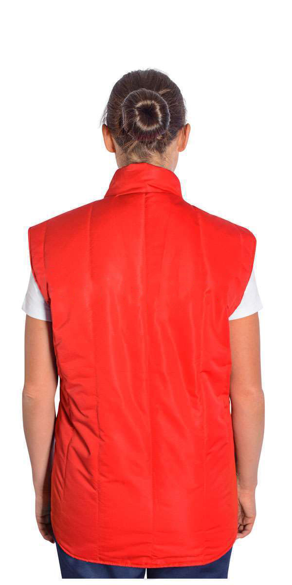 Жилет с удлиненной спинкой, с центральной застежкой на молнию "трактор", с накладными карманами внизу, застегивающимися на потайную кнопку, и с верхним карманом на "липучке".
