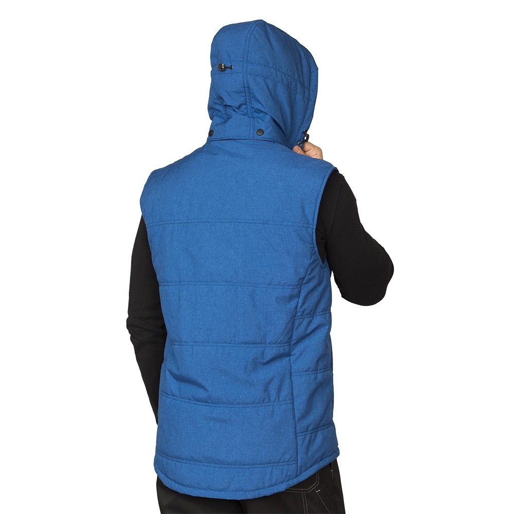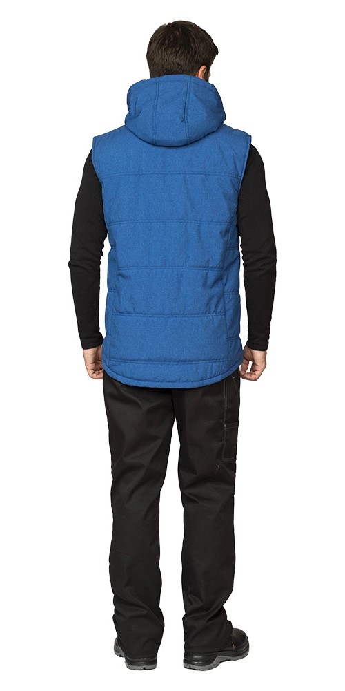 Жилет: утеплённый прямого силуэта с удлинённой спинкой, стёганный двойными горизонтальными строчками, центральная бортовая застёжка на молнию, флисовая подкладка обеспечит удобство при эксплуатации. Воротник-стойка утеплённый, внутри из флиса. На внешнем воротнике планка с кнопками для пристёгивания капюшона.