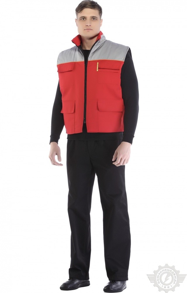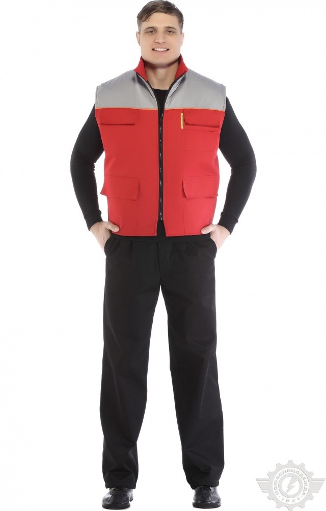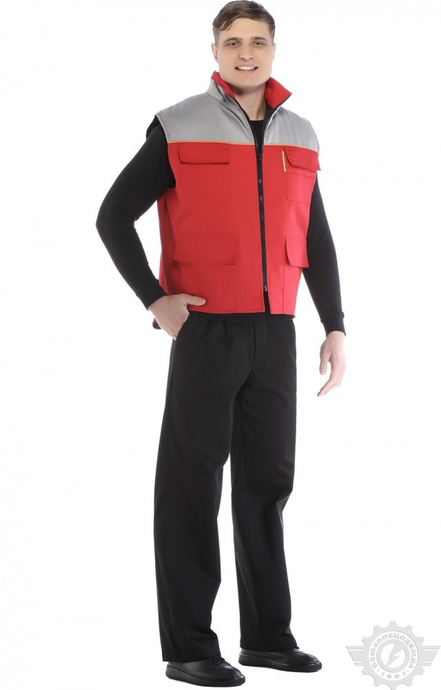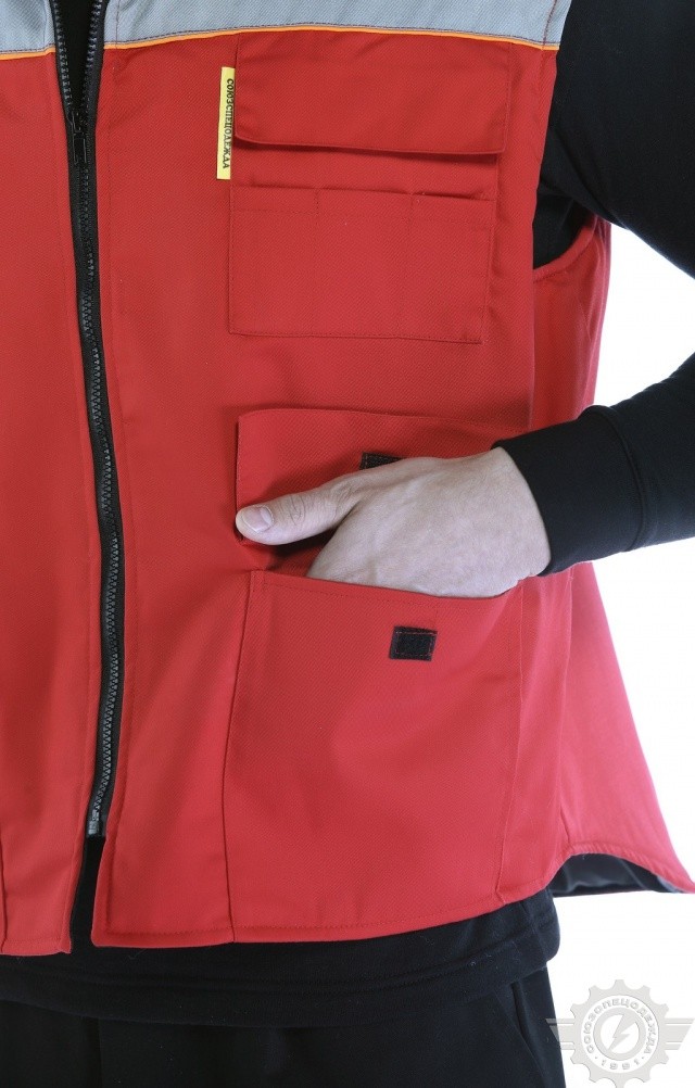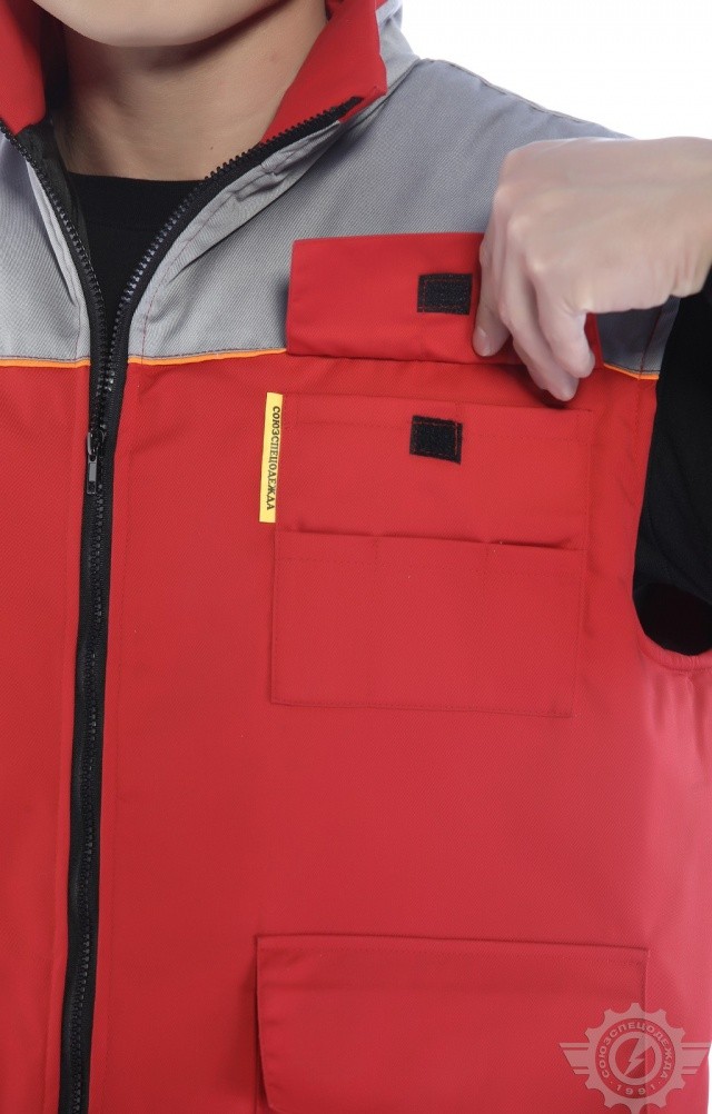 Утепленный жилет комбинированной (красной со светло-серым) расцветки используется в качестве рабочей одежды в осенне-зимний период.