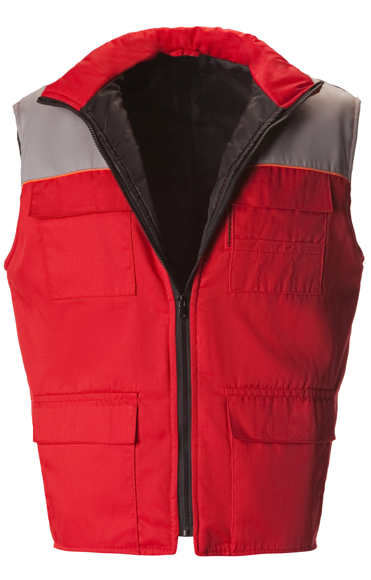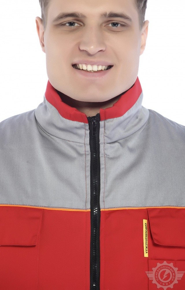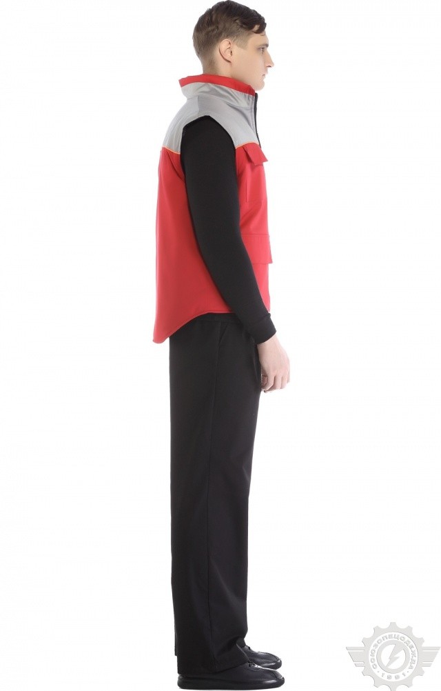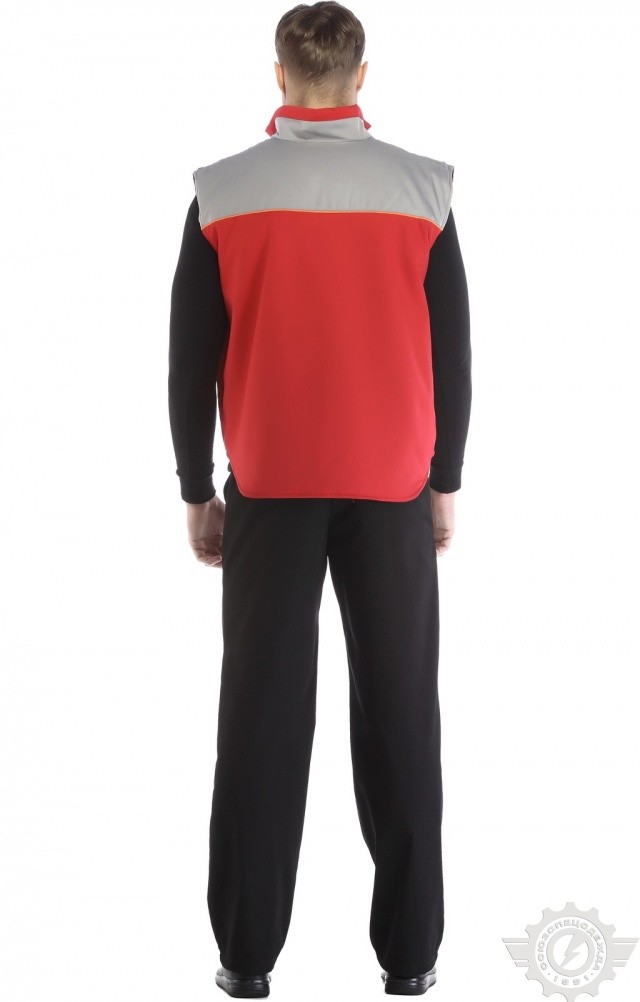 Утепленный жилет комбинированной (красной со светло-серым) расцветки используется в качестве рабочей одежды в осенне-зимний период.