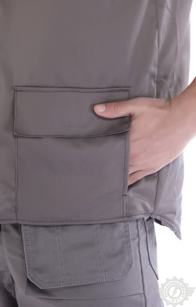 - Полочки с кокетками из ткани отделочного цвета с отделочным кантом в шве притачивания, верхними и нижними накладными карманами с клапанами. Застежка клапанов на контактную ленту, верхний накладной карман левой полочки с дополнительным накладным карманом.