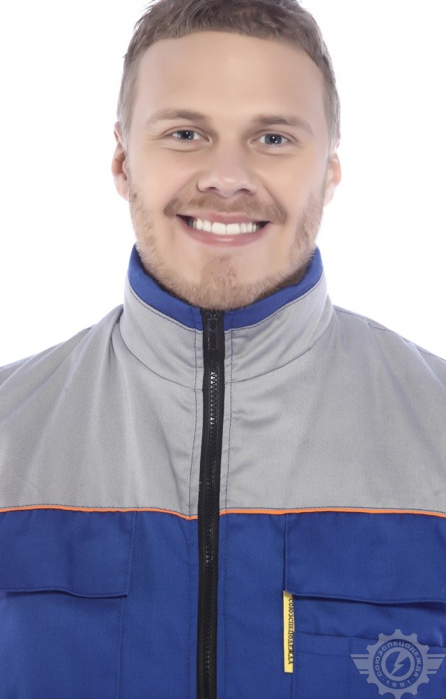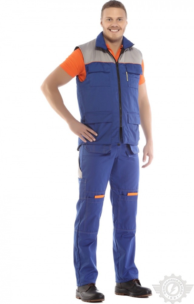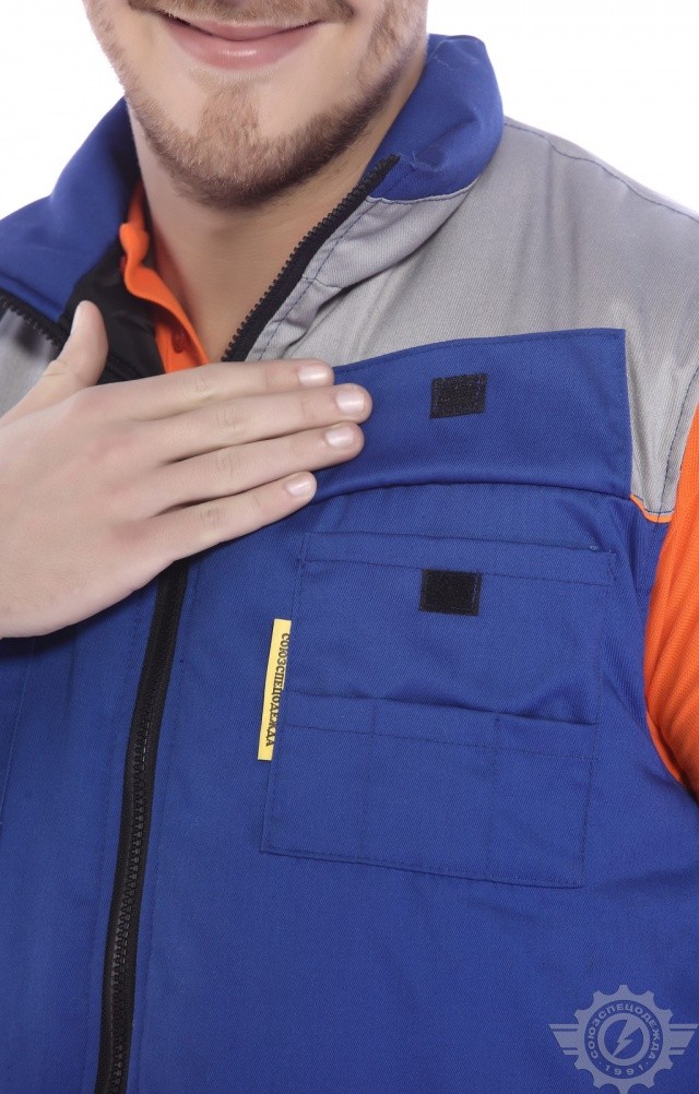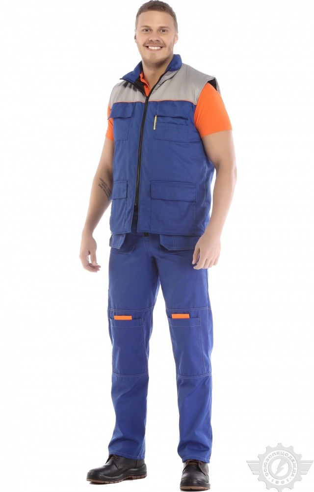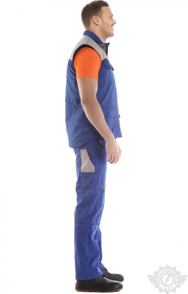 Зимний жилет “Профессионал” комбинированной расцветки (васильковый со светло-серым) используется в качестве рабочей одежды в условиях пониженных температур.