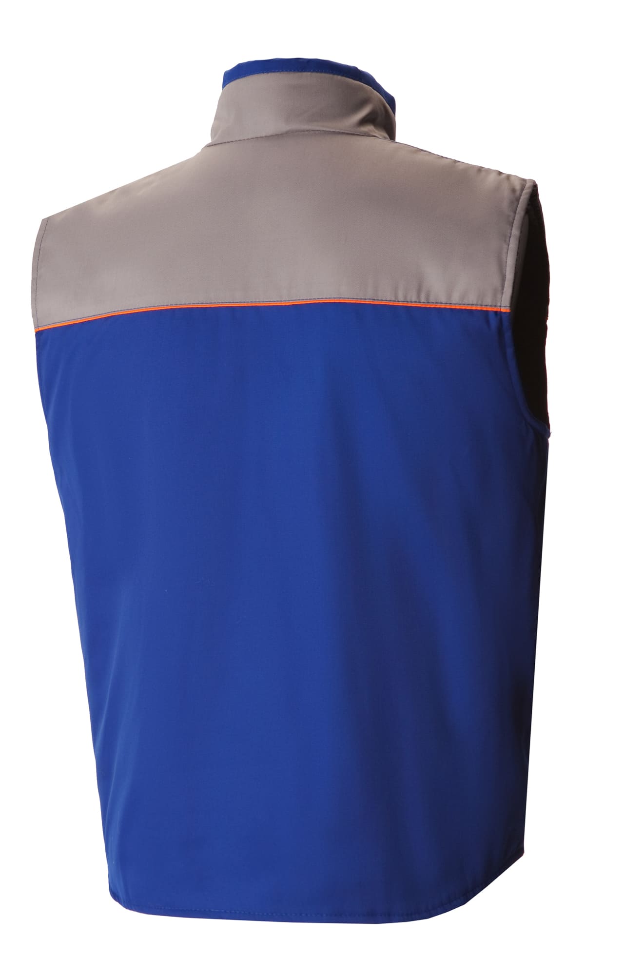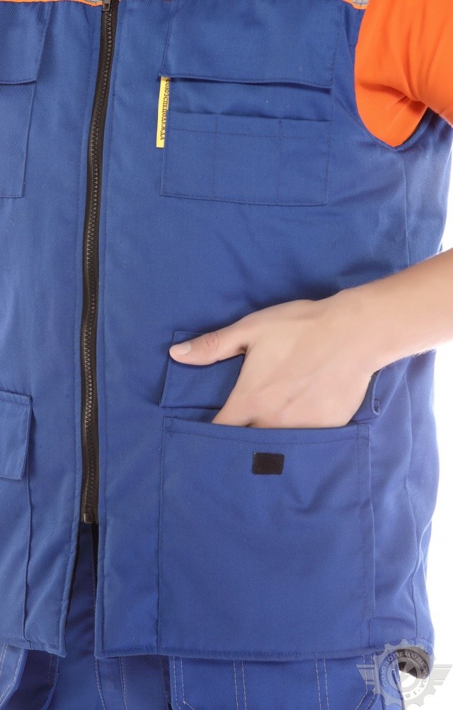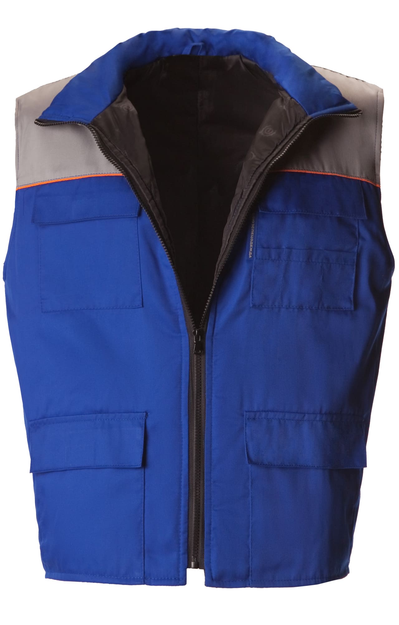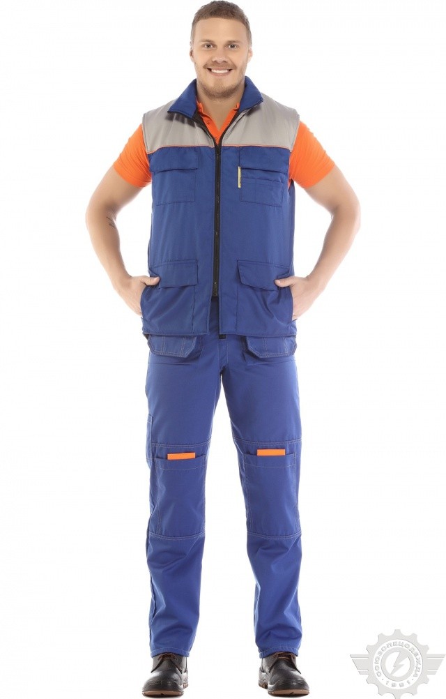 Зимний жилет “Профессионал” комбинированной расцветки (васильковый со светло-серым) используется в качестве рабочей одежды в условиях пониженных температур.