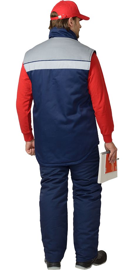 Жилет прямого силуэта; с центральной застёжкой на тесьму - «молнию» накрытую ветрозащитным клапаном, застёгивающимся на 5 кнопок; воротник - «стойка»; с кокетками полочек и спинки; с лентой светоотражающей шириной 50 мм 100% п/э настроченными по верхнему краю полочек и спинки на 5 мм ниже шва притачивания кокеток; с различными многофункциональными карманами.