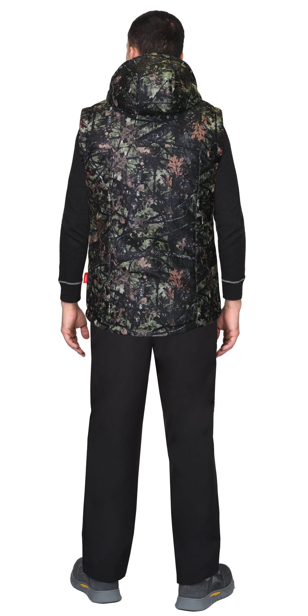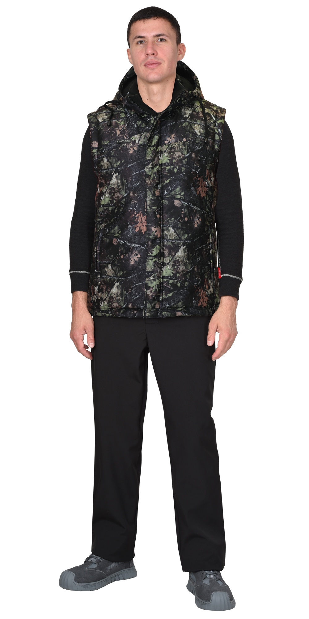 Жилет утепленный, полуприлегающего силуэта, с центральной бортовой застёжкой на молнию, с ветрозащитной планкой на кнопках, с пристёгивающимся капюшоном, с нижними карманами на молнию в рельефах, с внутренним карманом на молнию.