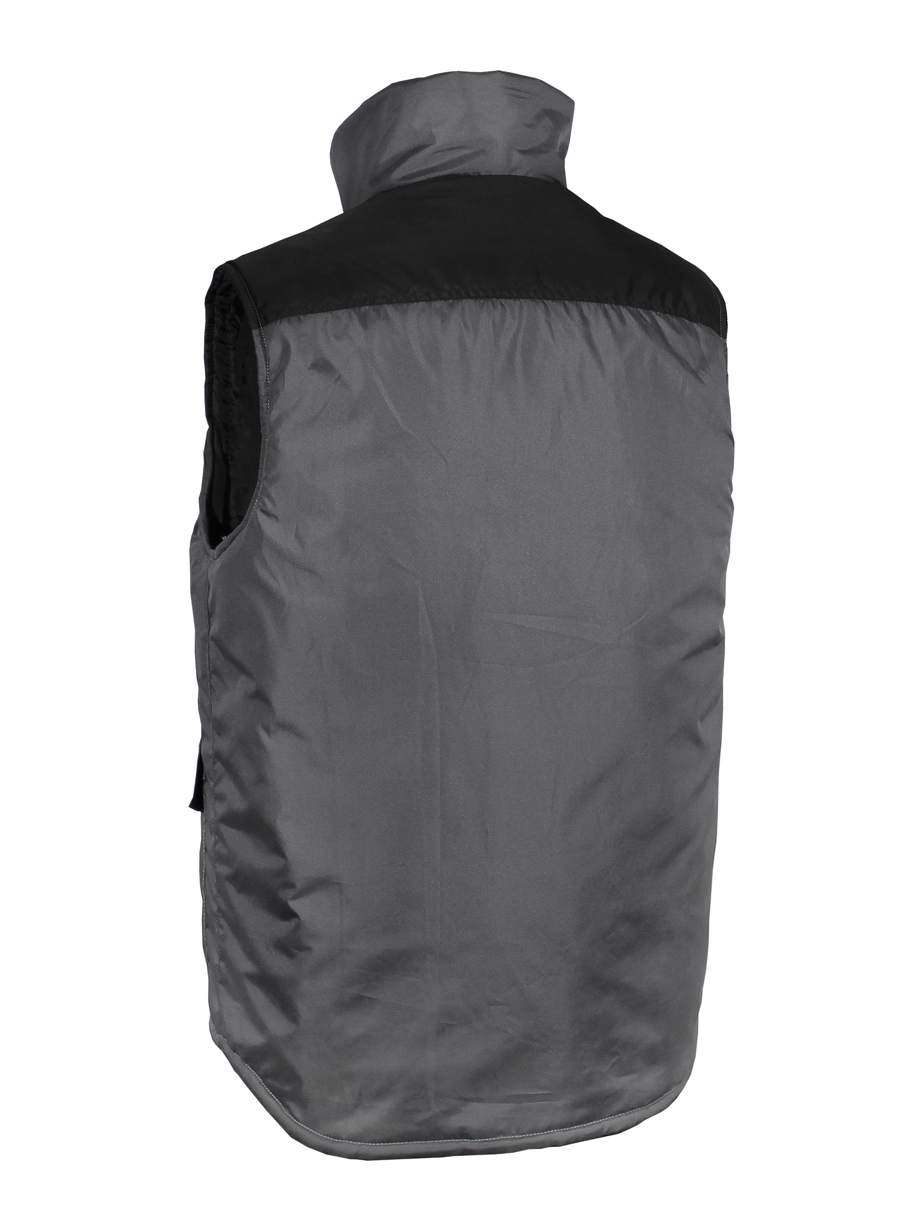 Жилет прямого силуэта на стеганой утепленной подкладке, с центральной бортовой застежкой на разъемную молнию. Полочки с отрезными кокетками из отделочной ткани, переходящими на спинку, с нижними объемным накладными карманами с клапанами, застегивающимися на контактную ленту. Клапаны фигурной формы. Спинка с отрезной кокеткой из отделочной ткани. Подкладка левой полочки с накладным карманом, застегивающимся на контактную ленту. Воротник-стойка с внутренним воротником из флиса.