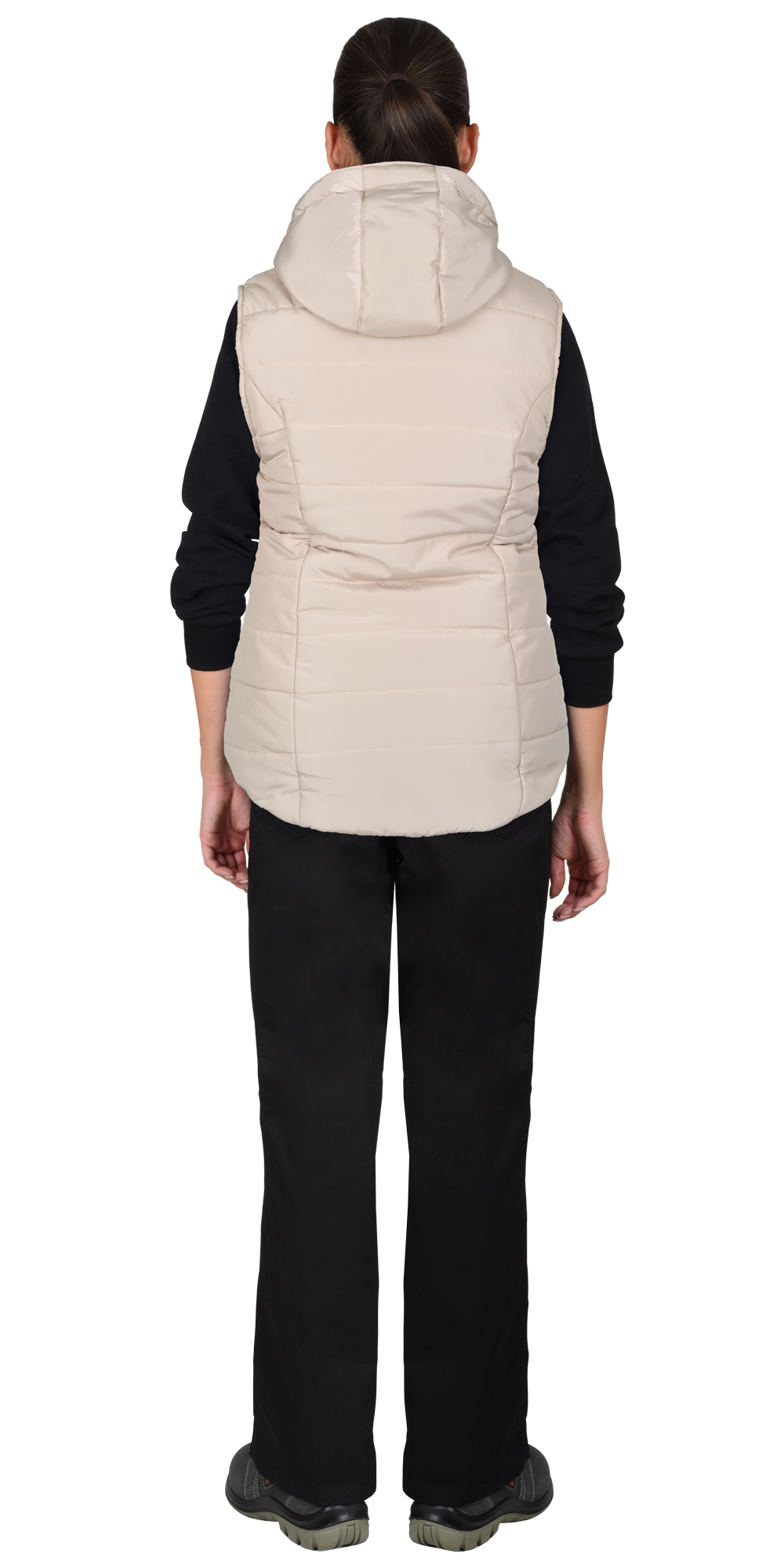 Жилет утеплённый, выстеган с утеплителем горизонтальными строчками, с центральной застёжкой на молнию. С воротником стойка и съемным утепленным капюшоном. Жилет с двумя нижними прорезными карманами, частично прикрытыми клапанами с кнопками. Нижняя часть проймы стянута эластичной тесьмой, для лучшего прилегания. Жилет с фигурной линией низа спереди и сзади.