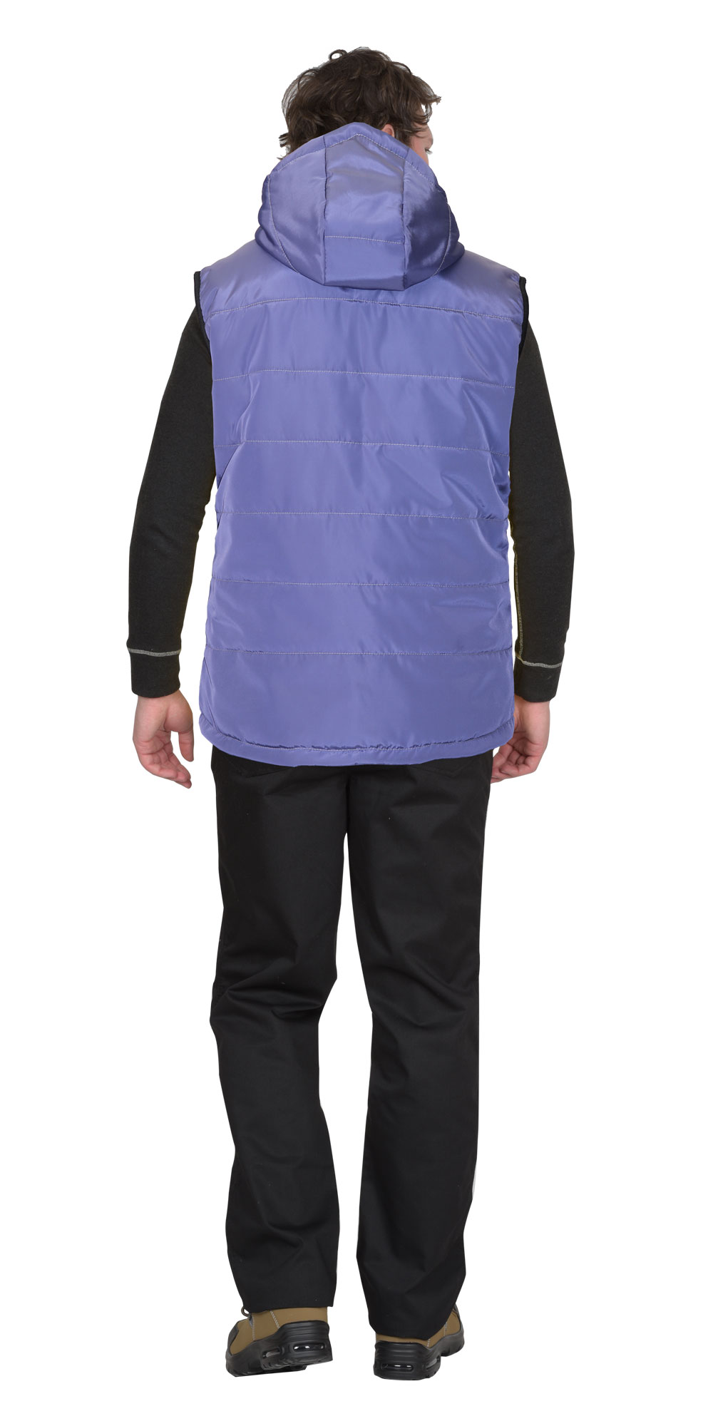 Жилет утеплённый, выстеган с утеплителем горизонтальными строчками, с флисовой подкладкой контрастного цвета, с втачным капюшоном, с застёжкой на молнию, прикрытую ветрозащитным клапаном от края капюшона до низа изделия, застёгивающимся на кнопки. Жилет с одним нагрудным карманом с молнией и двумя нижними карманами. Спинка жилета, удлинённая с фигурной линией низа. Пройма окантована резинкой. Объём капюшона по лицевому вырезу регулируется шнуром с фиксаторами.