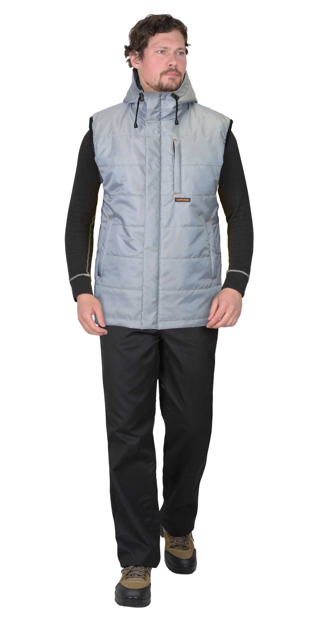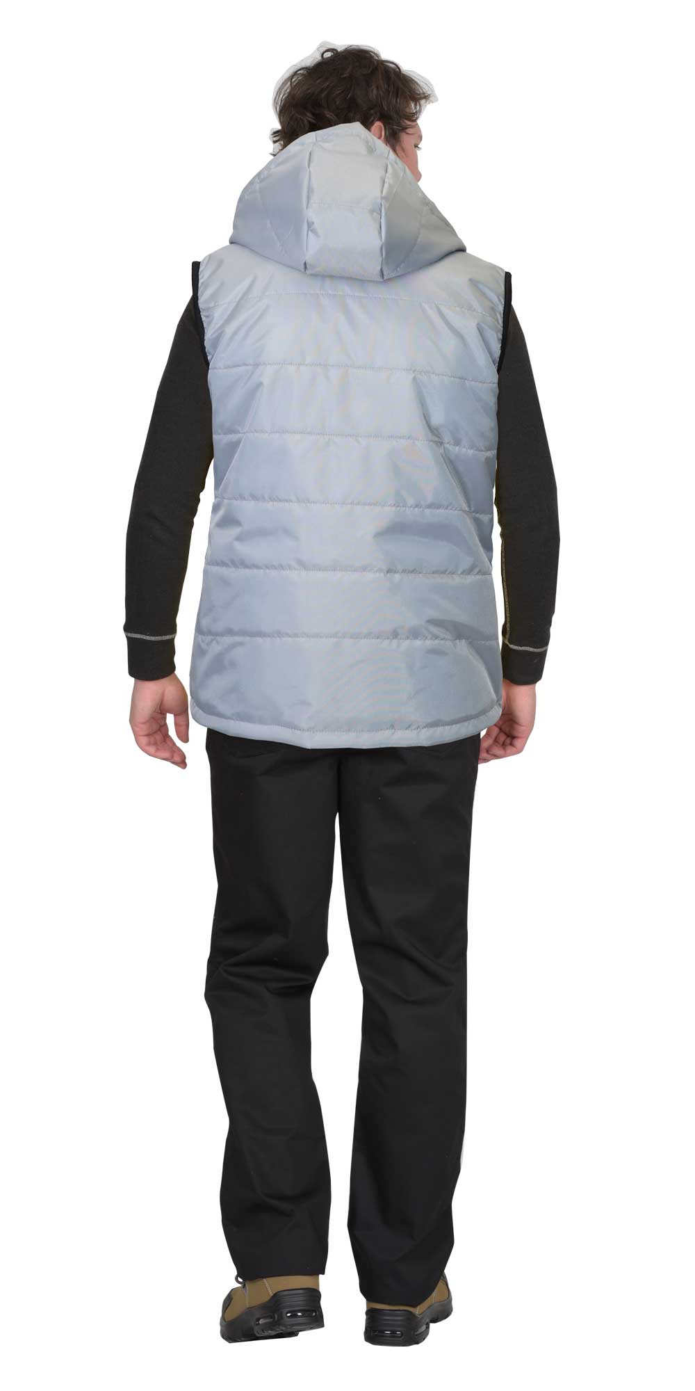 Жилет утеплённый, стёганный, на подкладке, с втачным капюшоном, с центральной застёжкой на молнию, закрытую ветрозащитным клапаном от края капюшона до низа изделия, застёгивающимся на кнопки. Жилет с одним нагрудным карманом с молнией и двумя нижними карманами. Спинка жилета, удлинённая с фигурной линией низа. Пройма окантована резинкой. Объём капюшона по лицевому вырезу регулируется шнуром с фиксаторами.